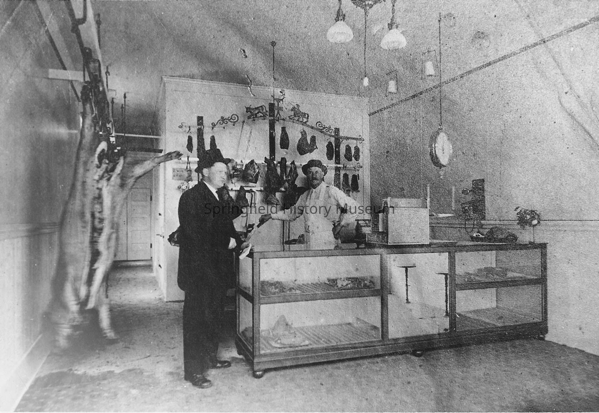 Business & Industry, People, Swarts Meat Market, Roy Jenkins, Charles Swarts, Butcher, Food, Main Street, 4th Street, Animal Carcass, Business, Business & Industry--Swarts Meat Market, Business & Industry--Personnel, Springfield--Streets--Main Street, Springfield--Streets--4th Street, People--Groups & Individuals