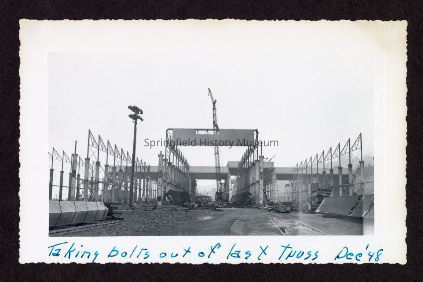 Photograph of "taking bolts out of last truss, Dec '48" (on bottom in pen)