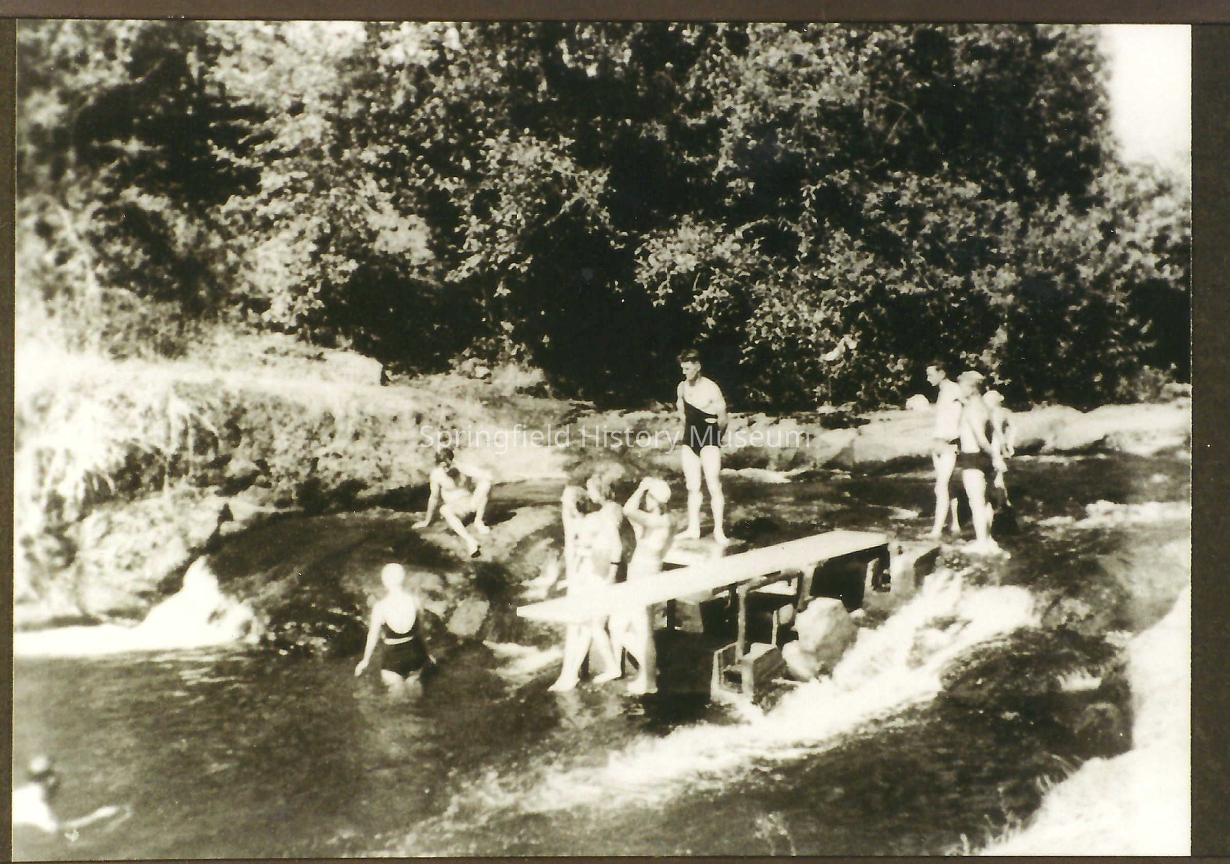 Photograph of ten people in and around plank diving board built in middle of river at a swimming hole at Wendling Park swimming hole, Wendling, Oregon July 1939
