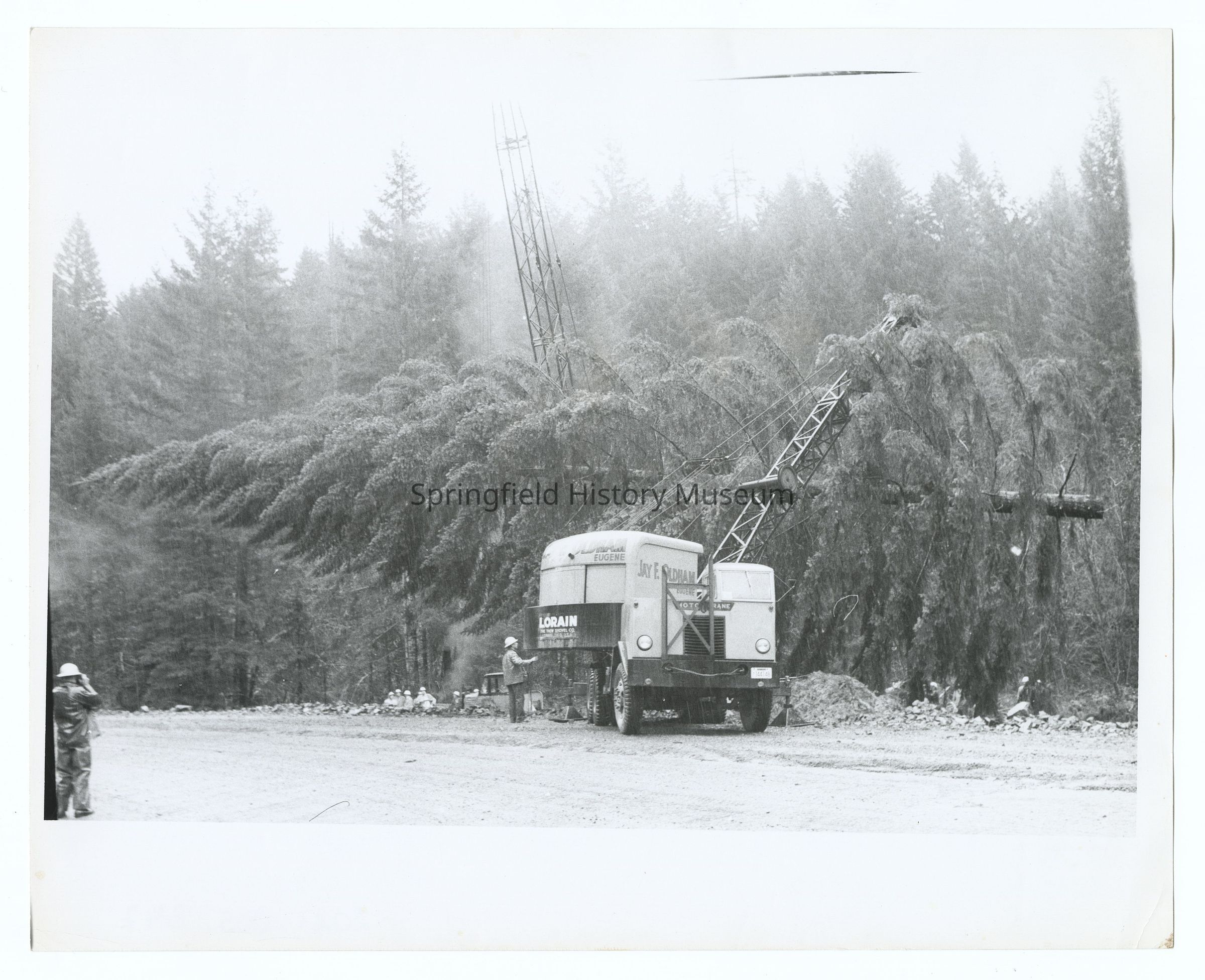 Photograph of the 1960's National Christmas Tree, Oregon's Presentation. Logging process. Shows Jay E. Oldham Eugene company and Lorain brand equipment.Photograph Details
