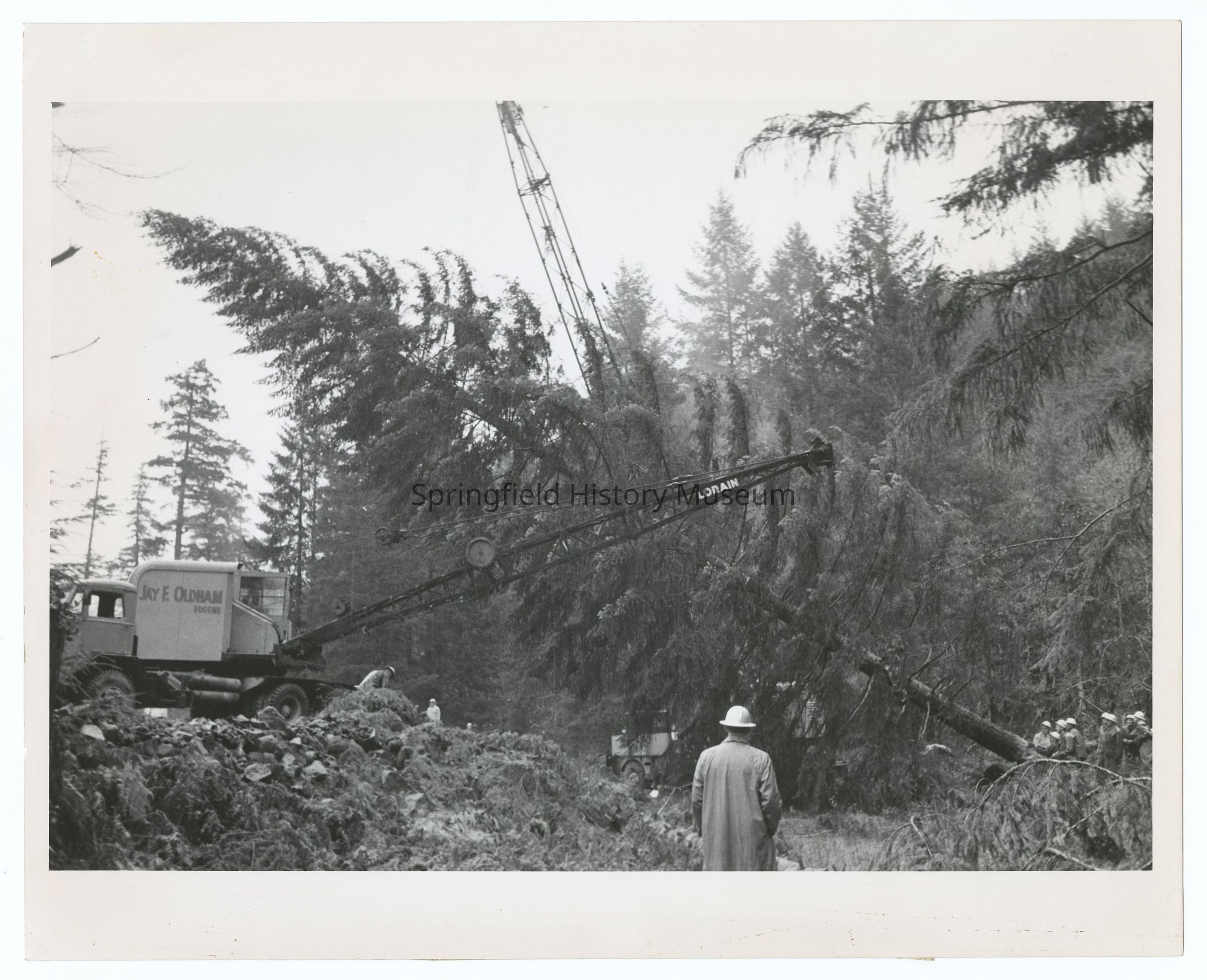 Photograph of the 1960's National Christmas Tree, Oregon's Presentation. Logging process. Shows Jay E. Oldham Eugene company and Lorain brand equipement.Photograph Details
