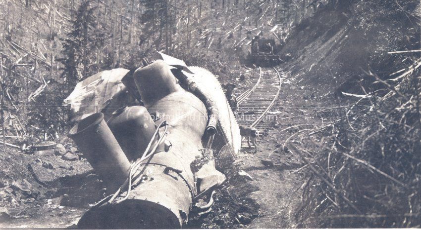 Booth-Kelly 4-Spot Heisler after boiler explosion on April 23, 1920. Probably taken the day after the wreck. This is on the Camp 9 switchbacks. Boiler in foreground, where it landed, and the carriage in the background. There is a dog and unidentified man behind the boilerPhotograph Details