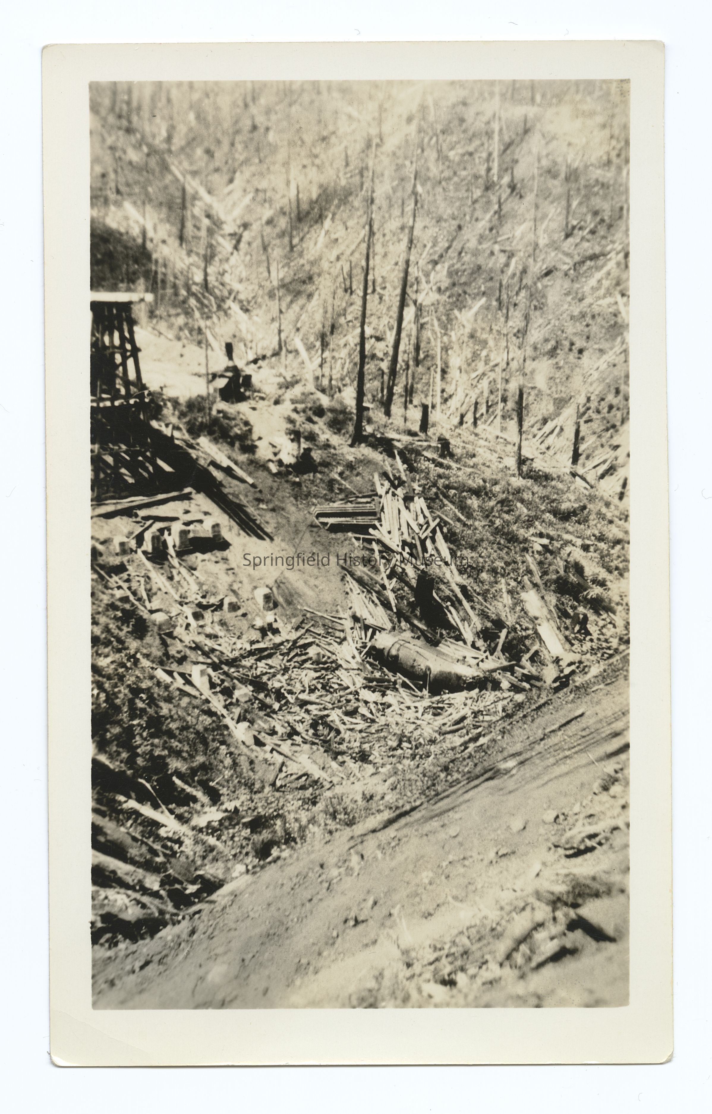 Photograph of the collapse of a train trestle bridge, Tillamook Branch, South Pacific Railroad, 1939-1940Photograph Details