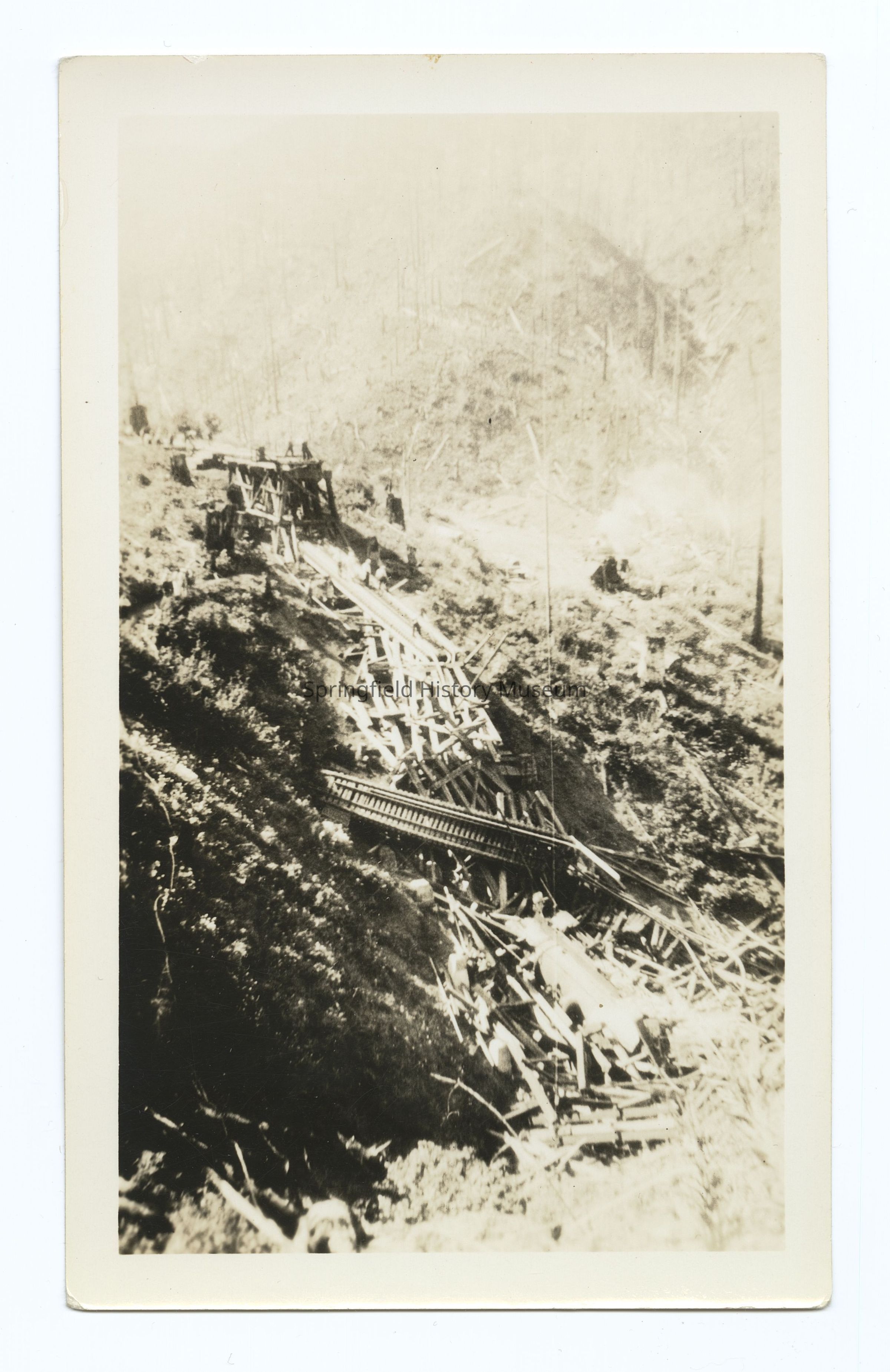 Photograph of the collapse of a train trestle bridge, Tillamook Branch, South Pacific Railroad, 1939-1940Photograph Details