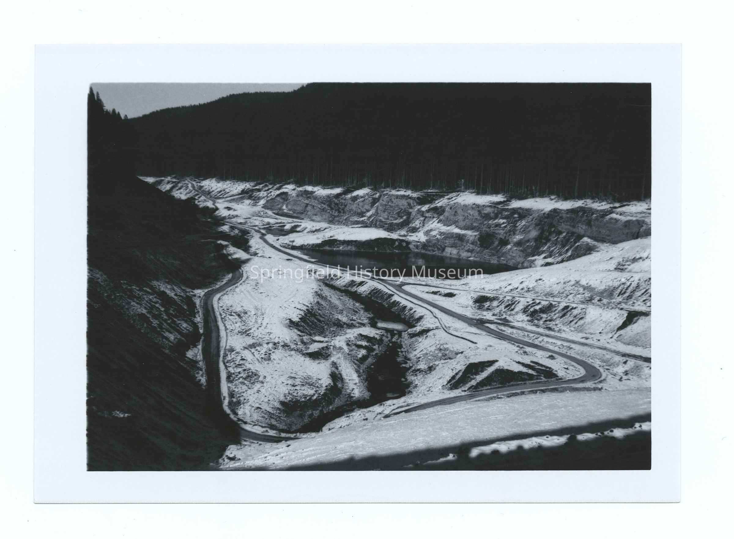 Photograph of the construction of a reservoir, Oregon, undated. Possibly Lookout Point or Blue River Reservoir during winter.Photograph Details