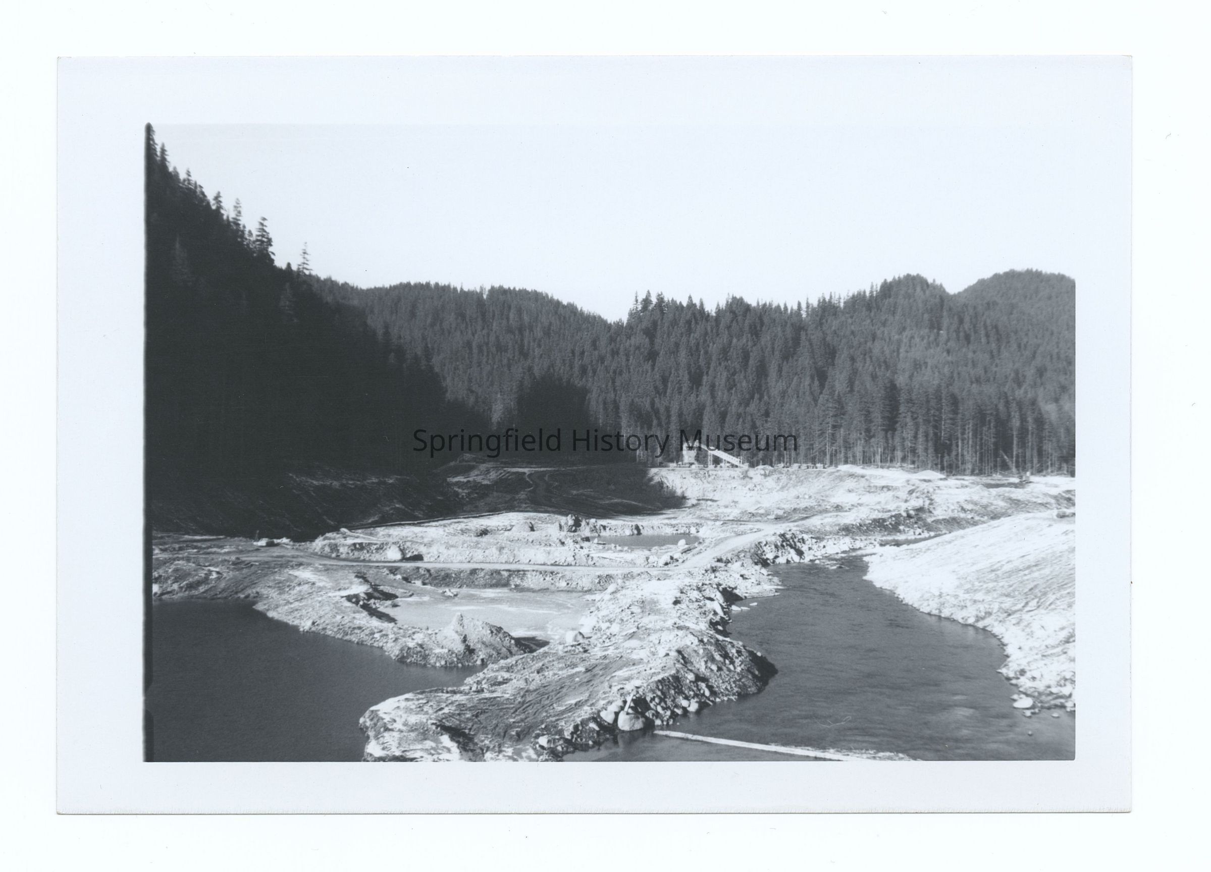 Photograph of the construction of a reservoir, Oregon, undated. Possibly Lookout Point or Blue River Reservoir during winter.Photograph Details