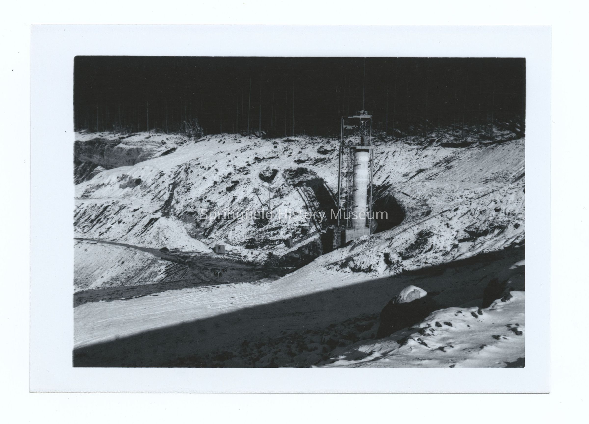 Photograph of the construction of a reservoir, Oregon, undated. Possibly Lookout Point or Blue River Reservoir during winter.Photograph Details