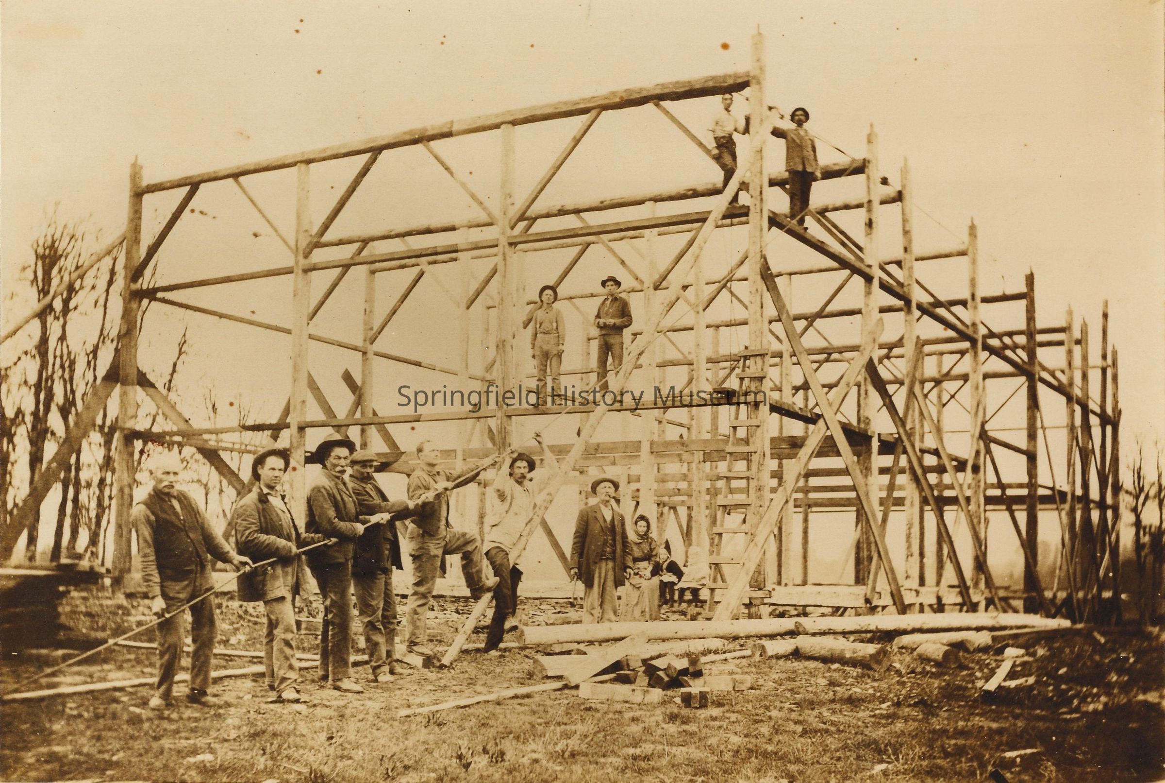 Workers putting up the framework of a barn, undated, circa 1900.