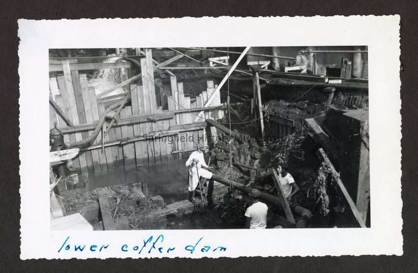 Photograph of the construction of the lower coffer dam at Booth-Kelly Lumber Mill, at bottom in pen: "lower coffer dam", unknown date