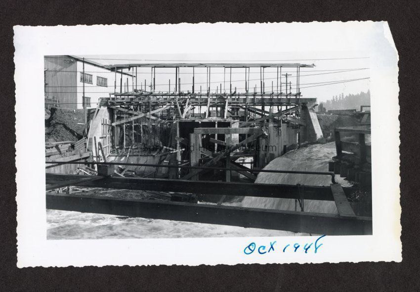 Photograph of the construction of the new dam at Booth-Kelly Lumber Mill, on bottom in pen: "Oct 1948"