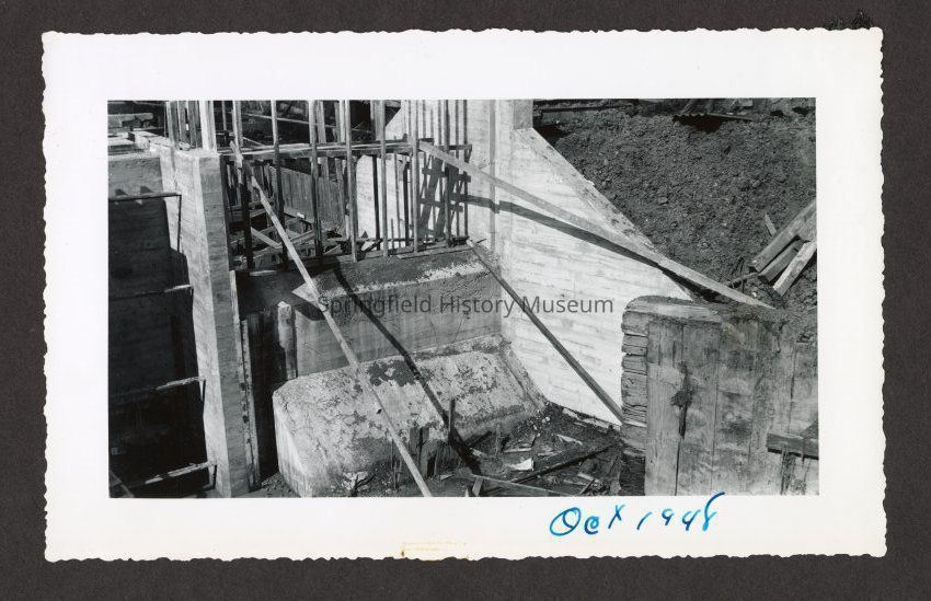 Photograph of the construction of the new dam at Booth-Kelly Lumber Mill, on bottom in pen: "Oct 1948"