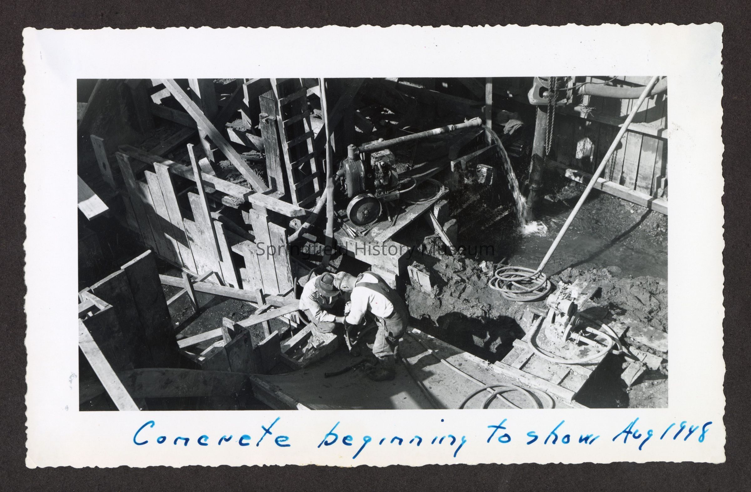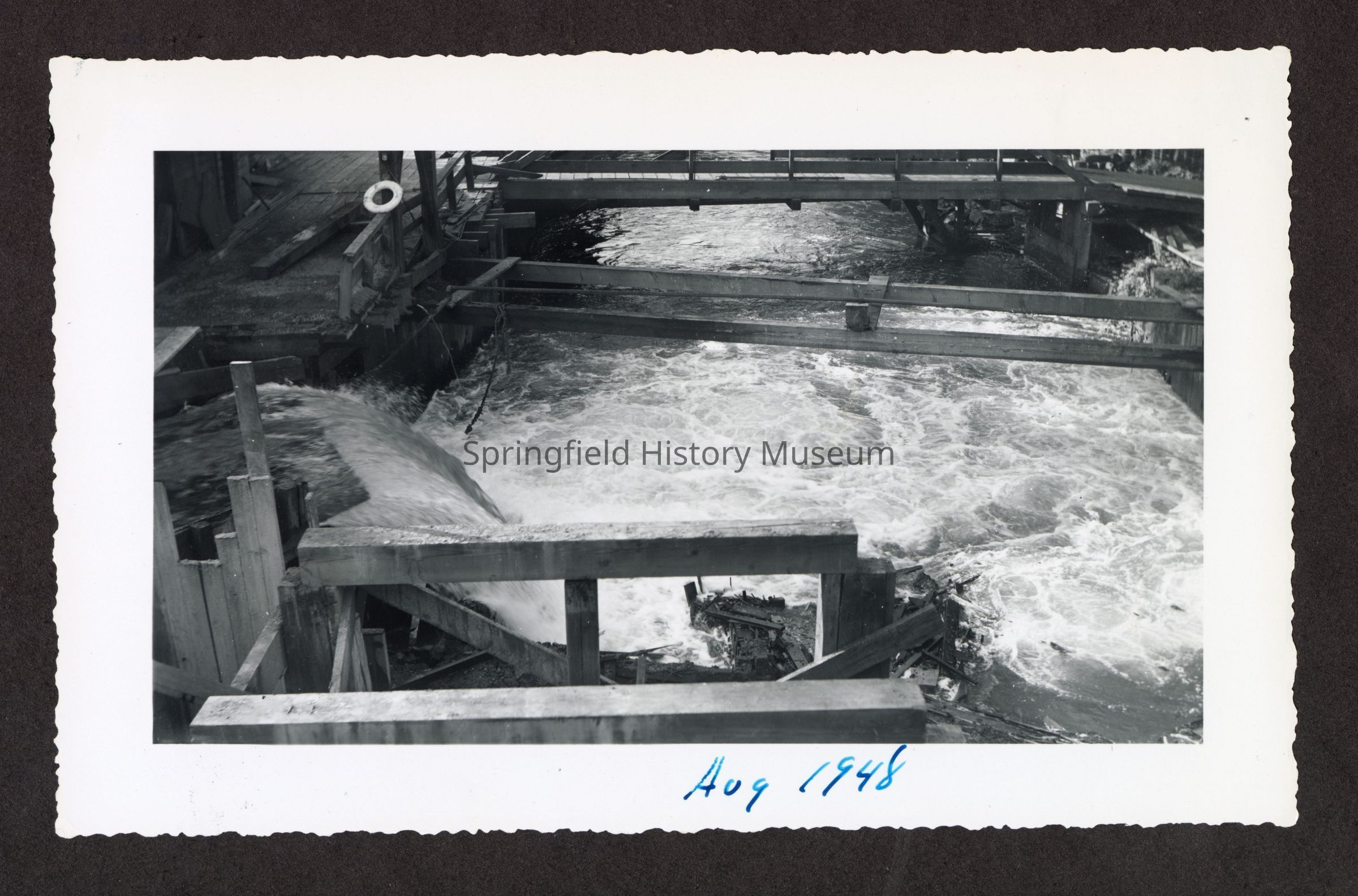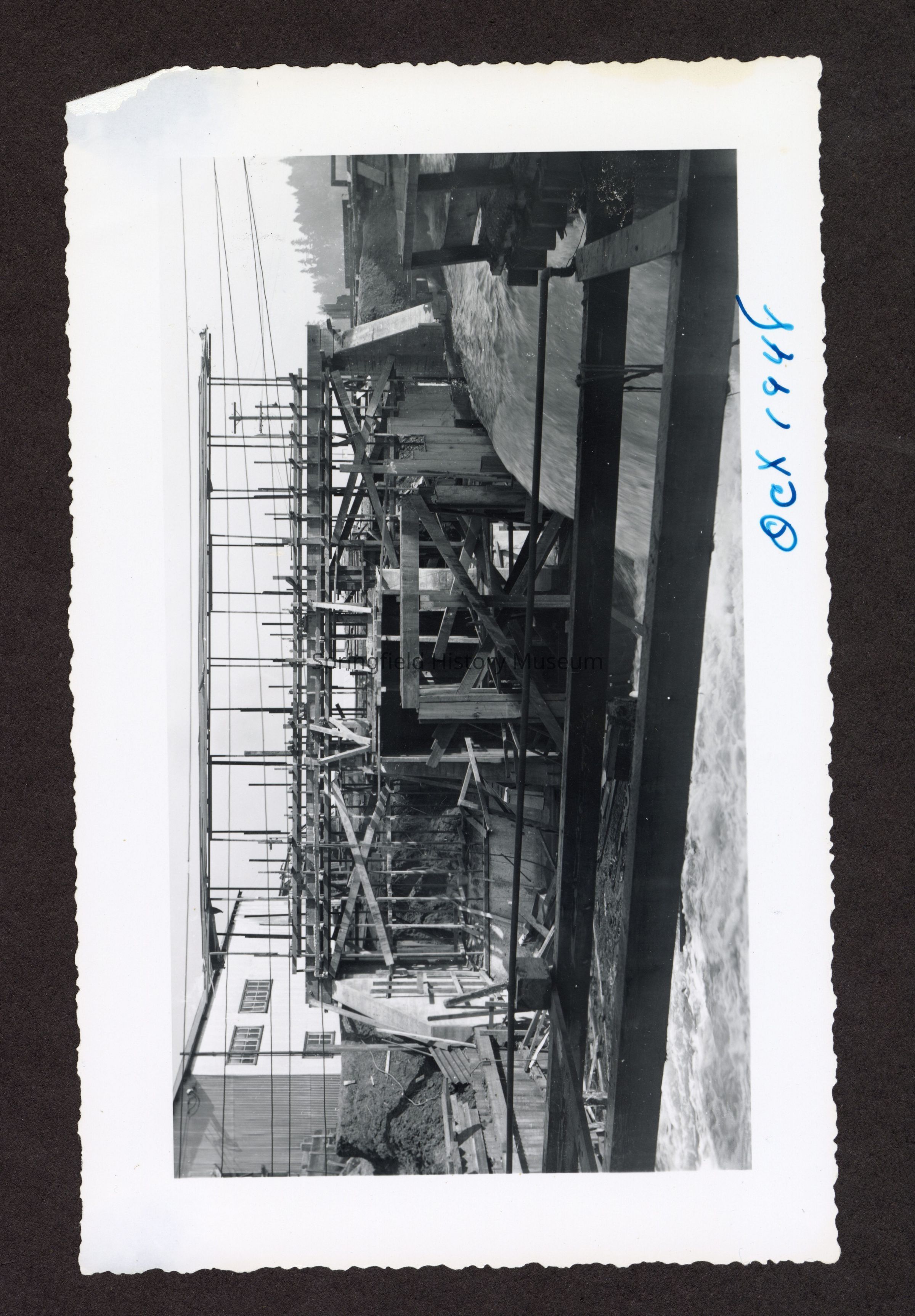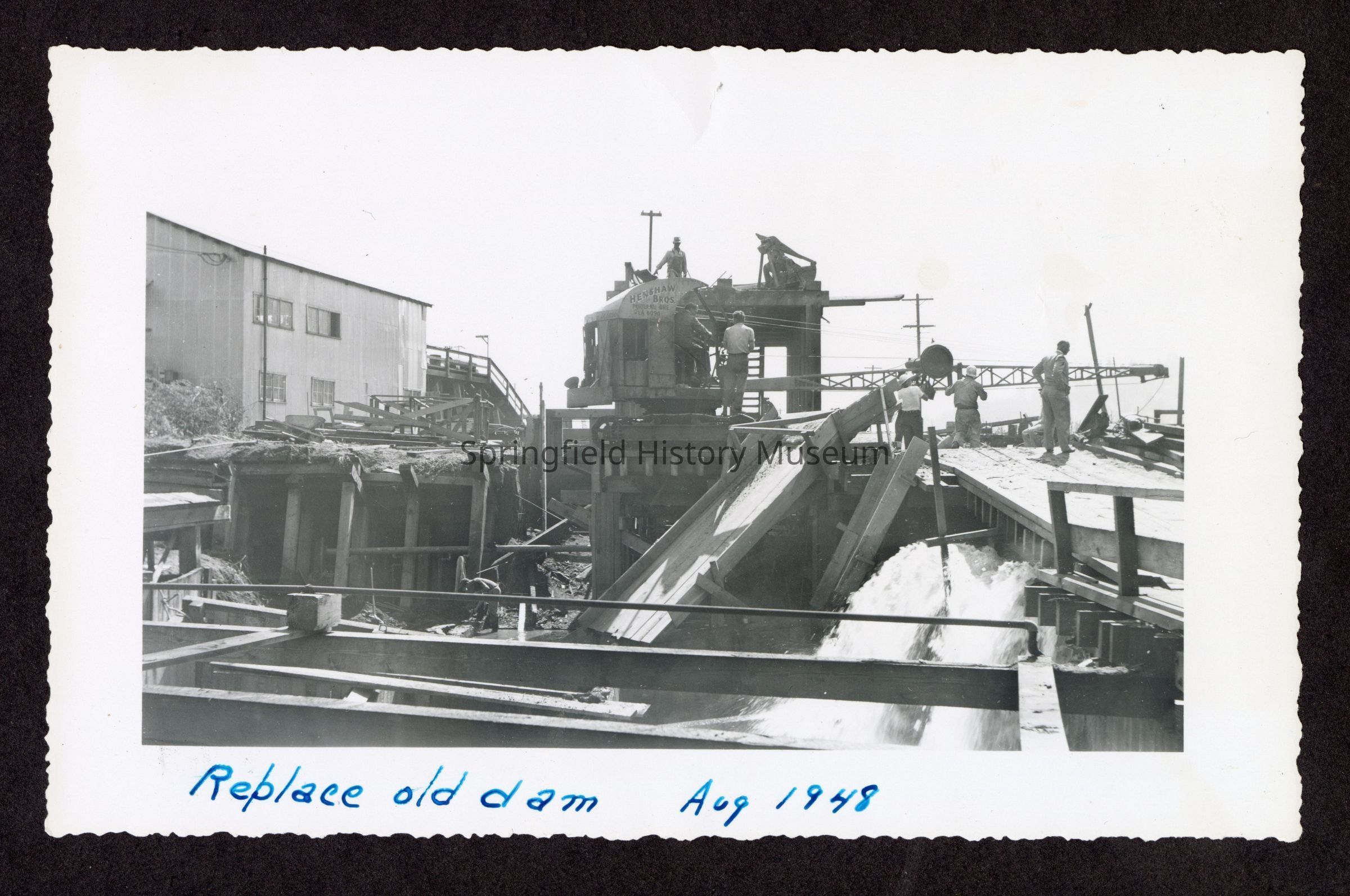 Photograph of the construction of the new dam at Booth-Kelly Lumber Mill, on back in pen: "Aug 1948"