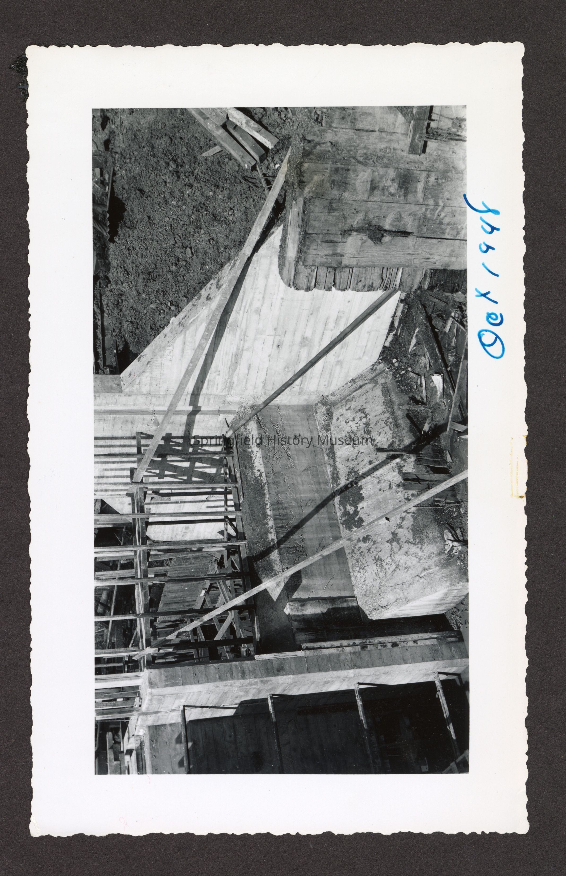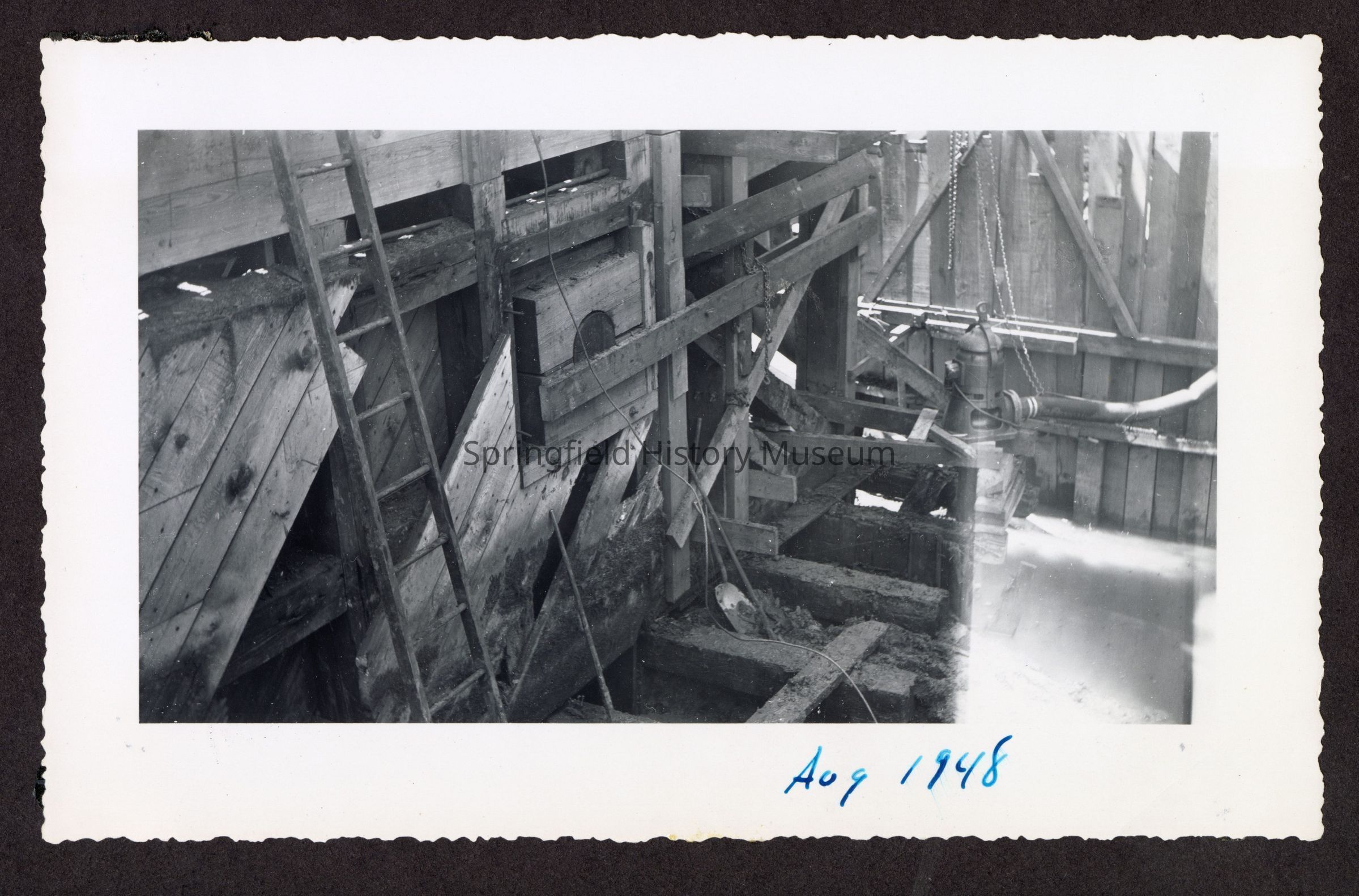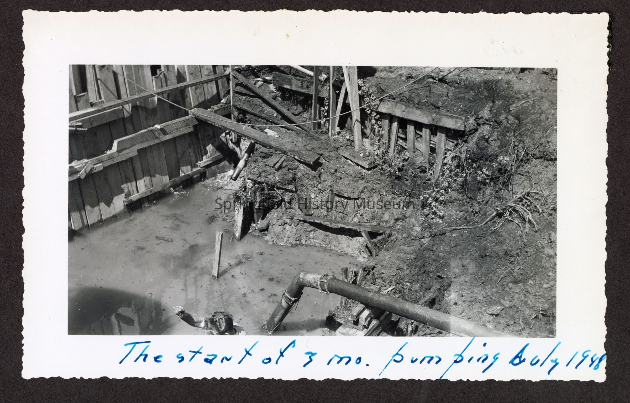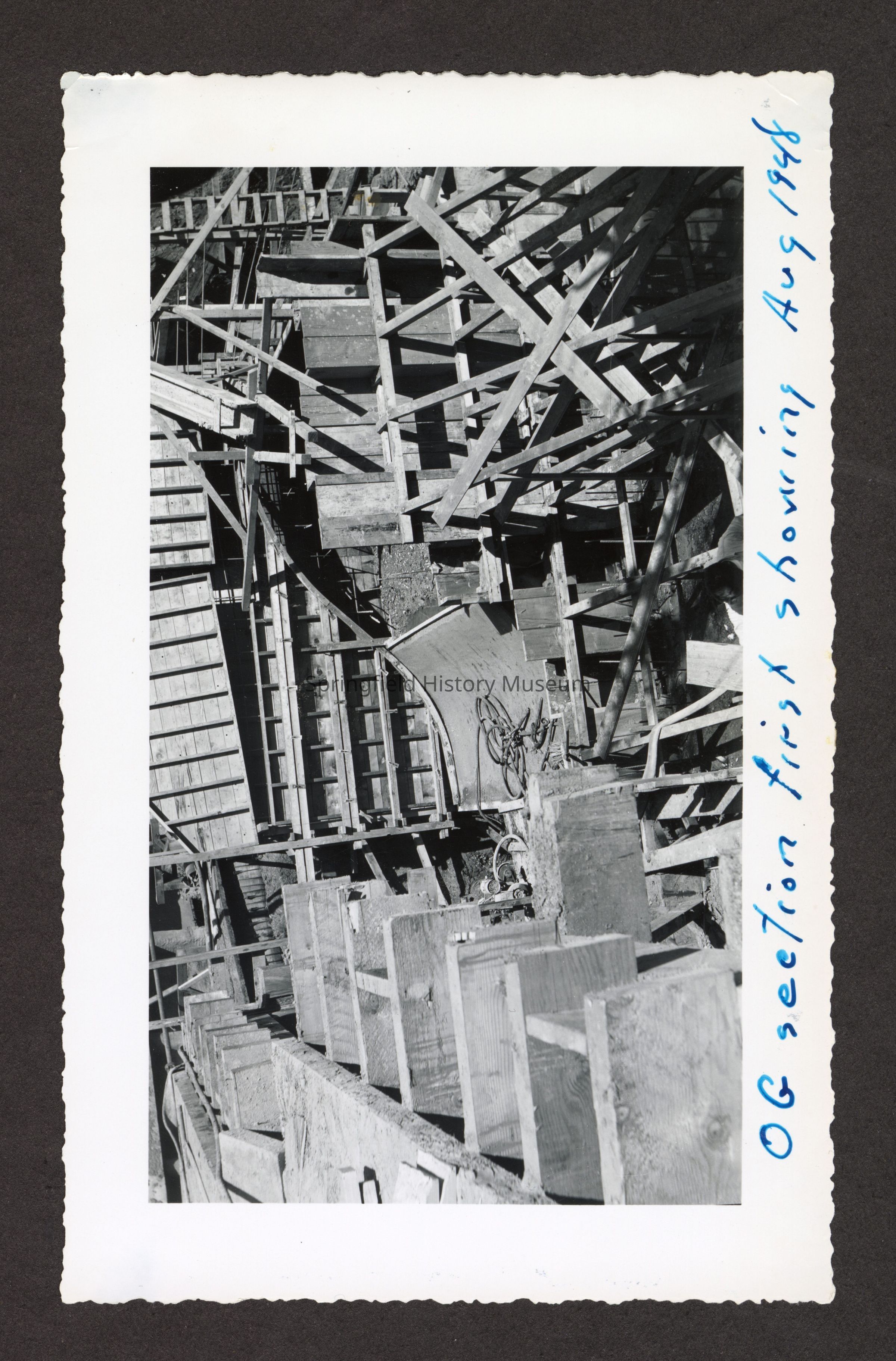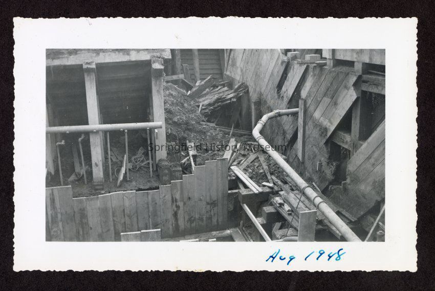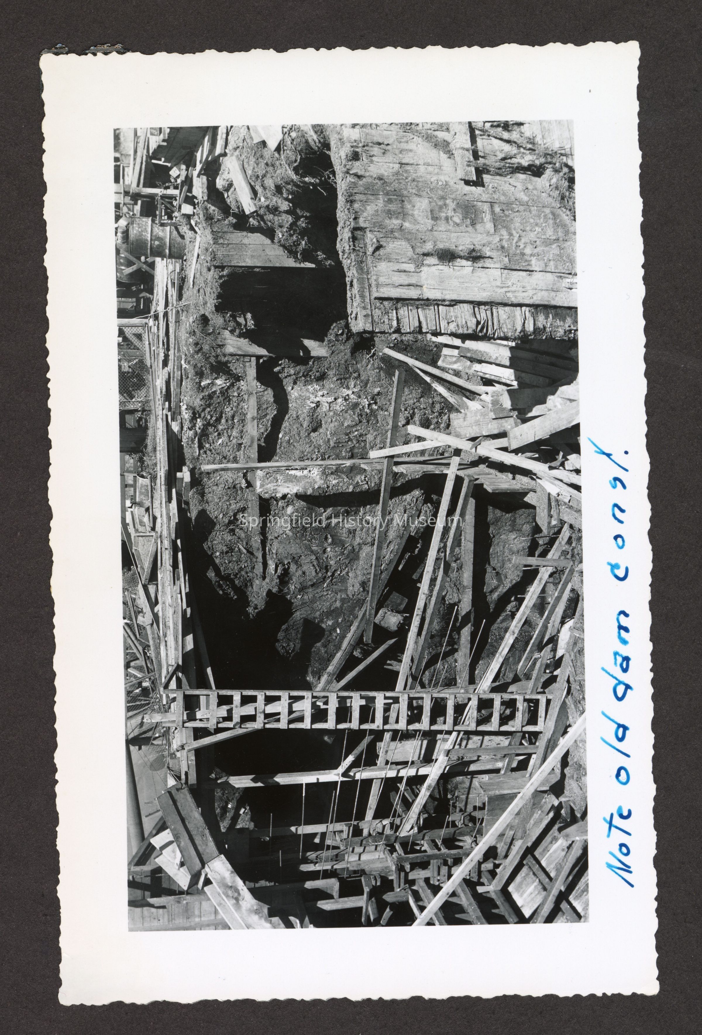 Photograph of the construction of the new dam at Booth-Kelly Lumber Mill, on back in pen: "Aug 1948"