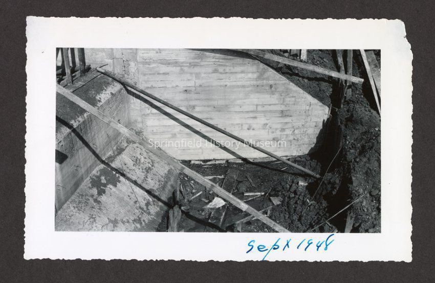 Photograph of the construction of the new dam at Booth-Kelly Lumber Mill, on bottom in pen: "Sept 1948"