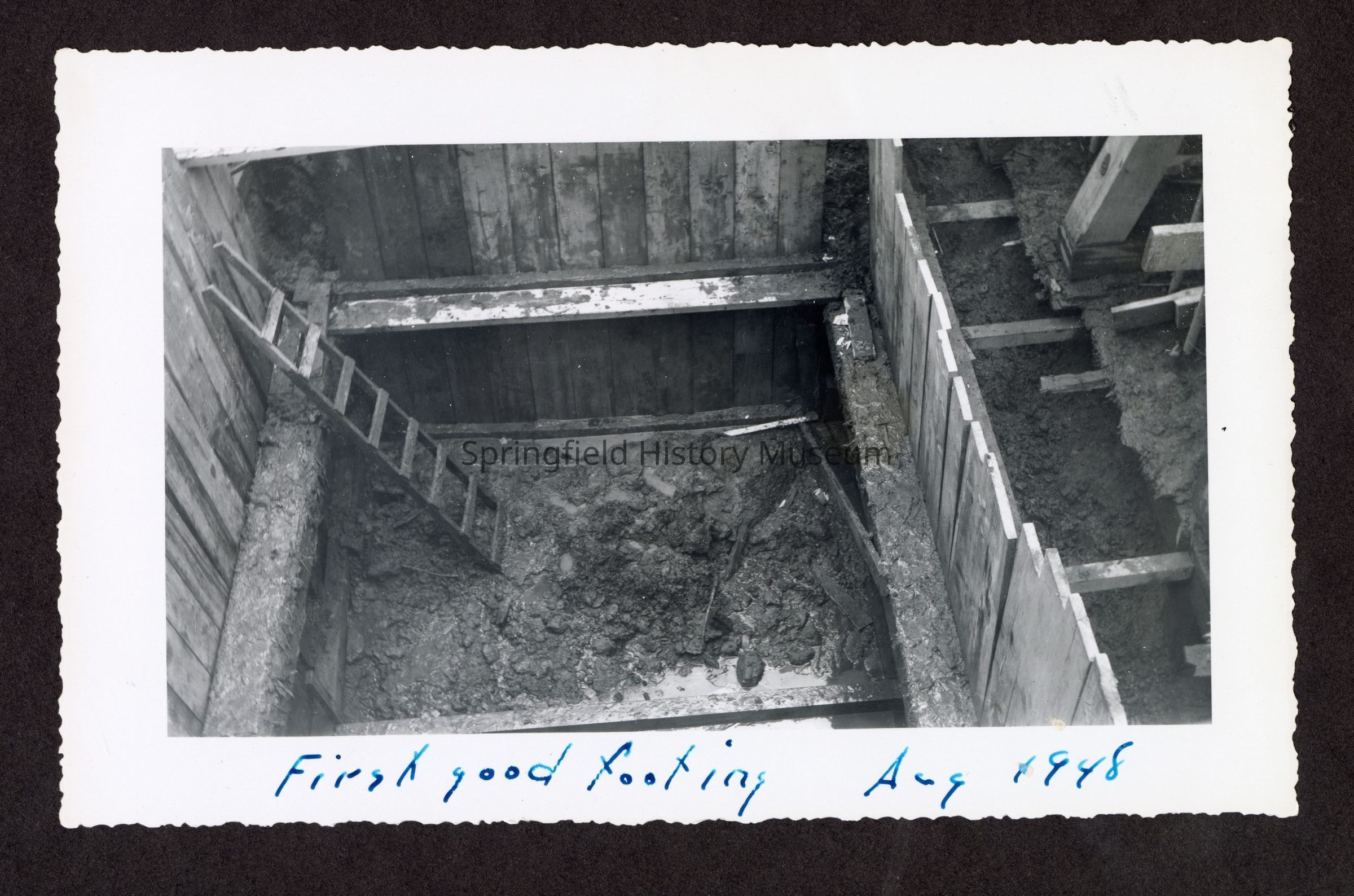 Photograph of the construction of the new dam at Booth-Kelly Lumber Mill, on bottom in pen: "First good footing, Aug 1948"