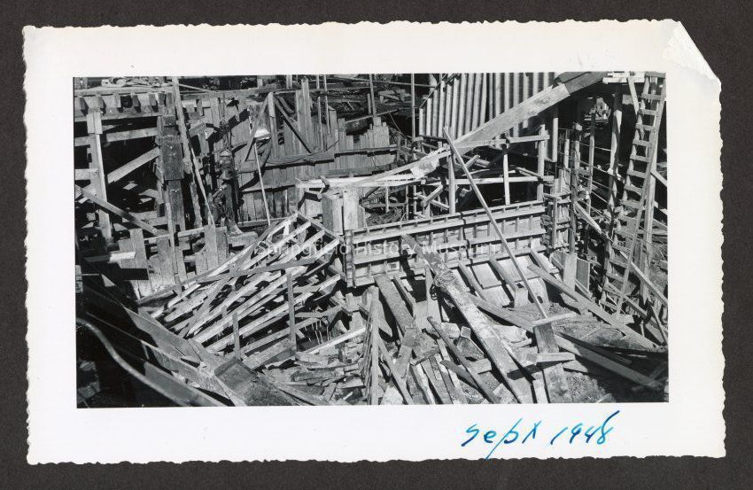 Photograph of the construction of the new dam at Booth-Kelly Lumber Mill, on bottom in pen: "Sept 1948"