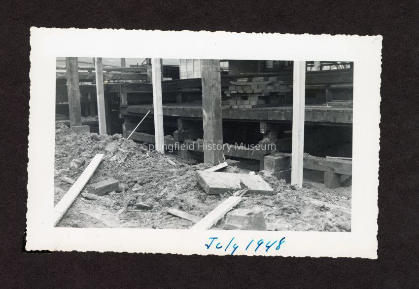 Photograph of a close up of piled dirt, wood and broken cement used in the draining and filling of the old log pond at Booth Kelly Lumber Mill, on bottom in pen: "July 1948"Made/Created