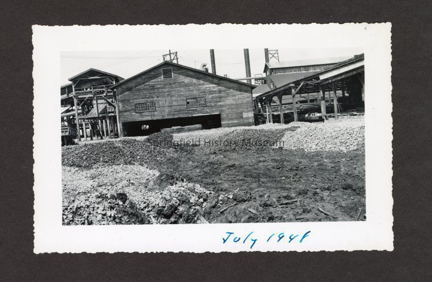 Photograph of the filling of the old log pond at Booth-Kelly Lumber Mill, at bottom in pen: "July 1948"