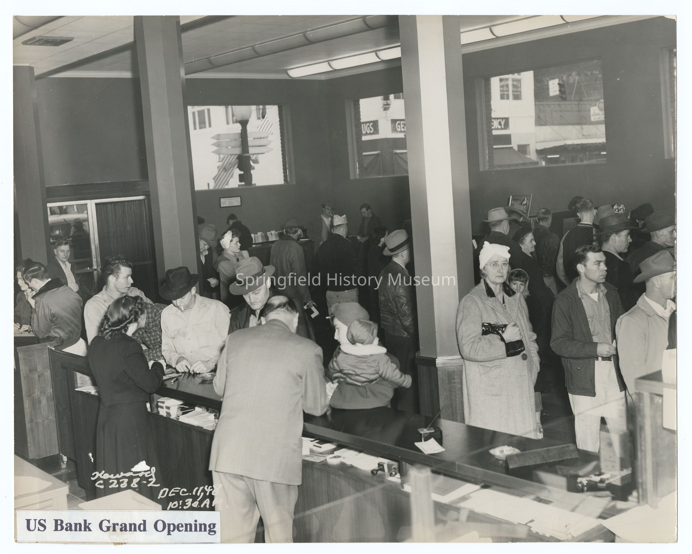 Photograph of the Grand Opening of the US Bank, Springfield, 12/11/1948. Interior view of the bank and visitors.Photograph Details