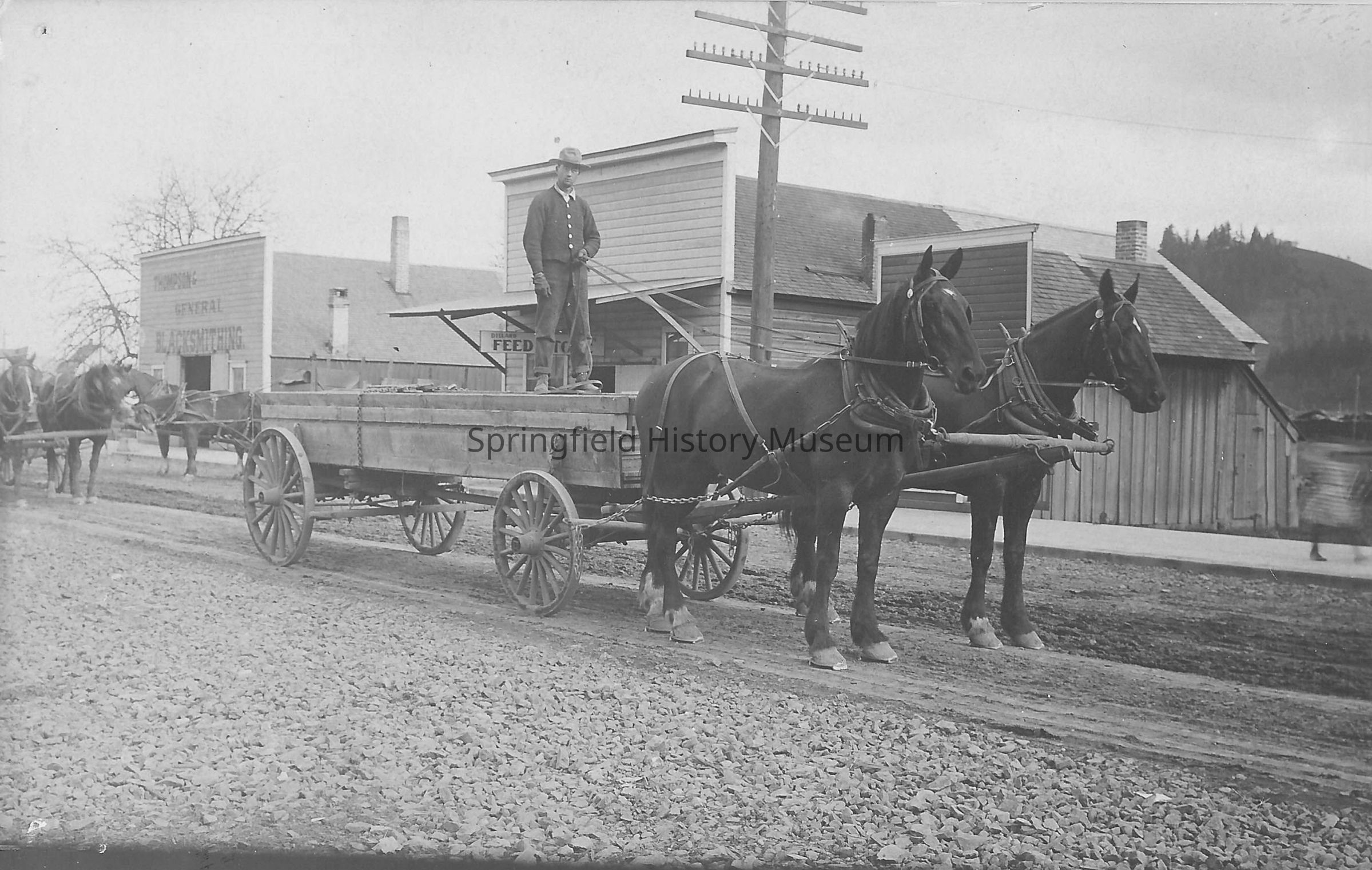 Construction, Street Views, Springfield Permanent Improvement, Main Street, 5th Street, 6th Street, Flat Bed Wagon, Horses, Wright & Sons, Thompson Blacksmith Shop, Fort's, Feed Store, Warehouse, Street Views, Postcard, Gravel, Springfield--Streets--Main Street, Springfield--Streets--5th Street, Springfield--Streets--6th Street, Transportation--Animal--Horses, Transportation--Wagon, Business & Industry--Thompson Blacksmith Shop, Business & Industry--Fort's, Business & Industry--Feed Store, Street Views--Springfield, Construction--Roads & Bridges, Construction--Personnel, People--Groups & Individuals