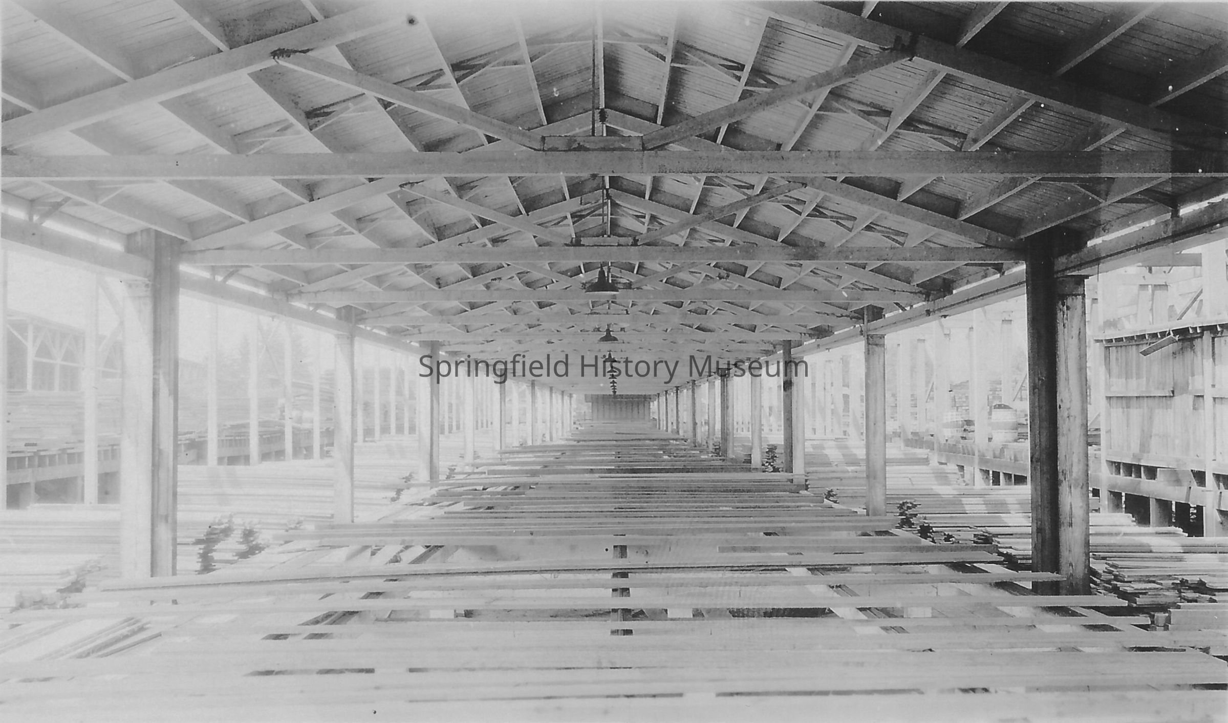 Photograph of the inside of the sorting shed at Booth-Kelly Mill in Wendling, Oregon