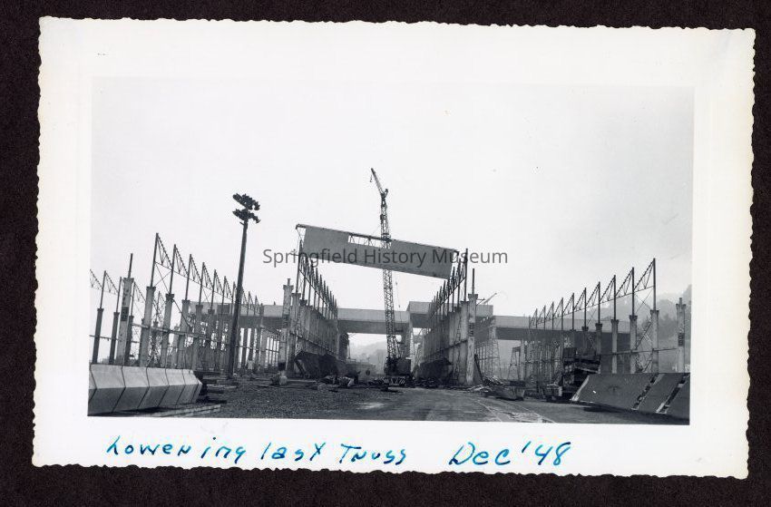 Photograph of the lowering of the last truss, on bottom in pen: "lowering last Truss, Dec '48"