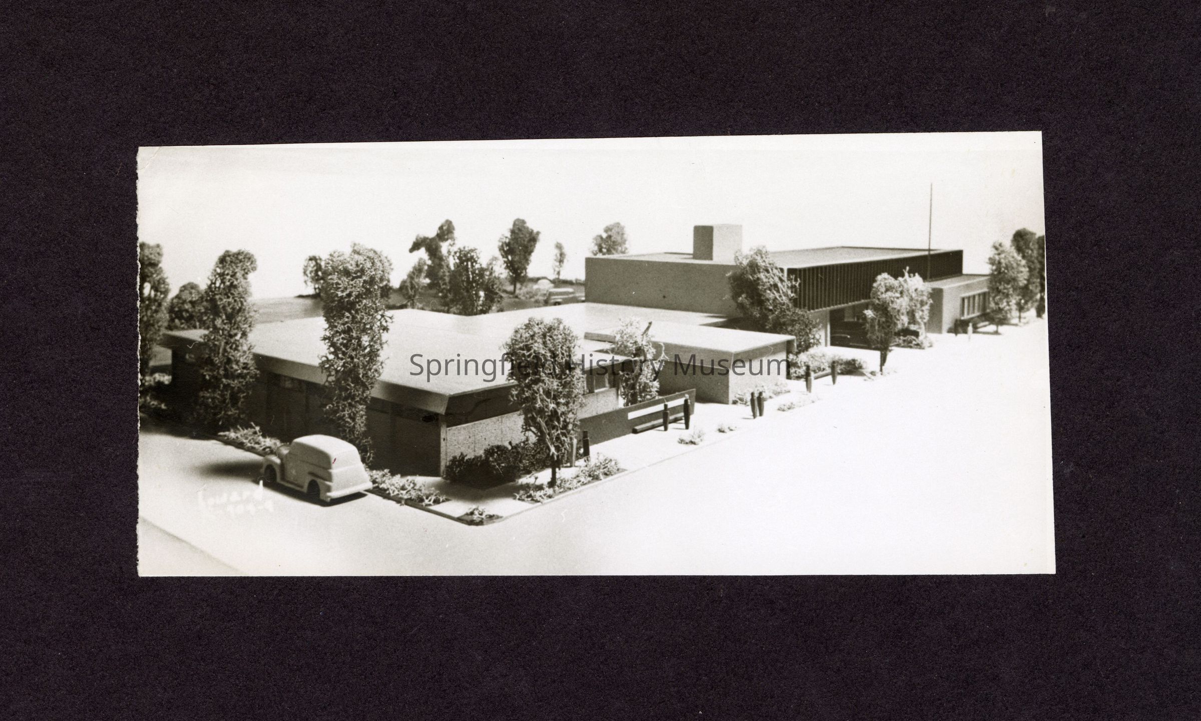 Photograph of the model of the 1960s Springfield Library Building. Former building circa 1950-1969.