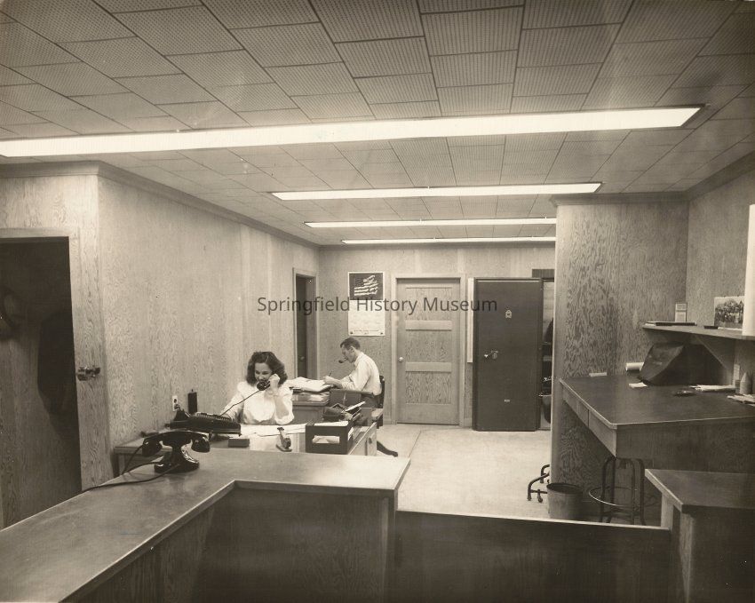 Photograph of Fischer Lumber Company, reception area of main office. Marcola, Oregon. Dated circa 1948.Photograph Details
