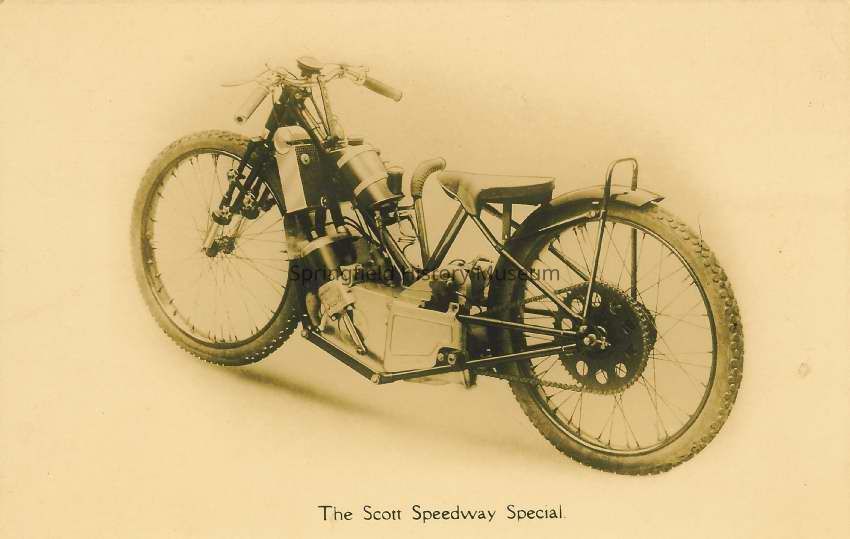 Postcard of a motorcycle. "The Scott Speedway Special" Undated possibly in the 1920's.