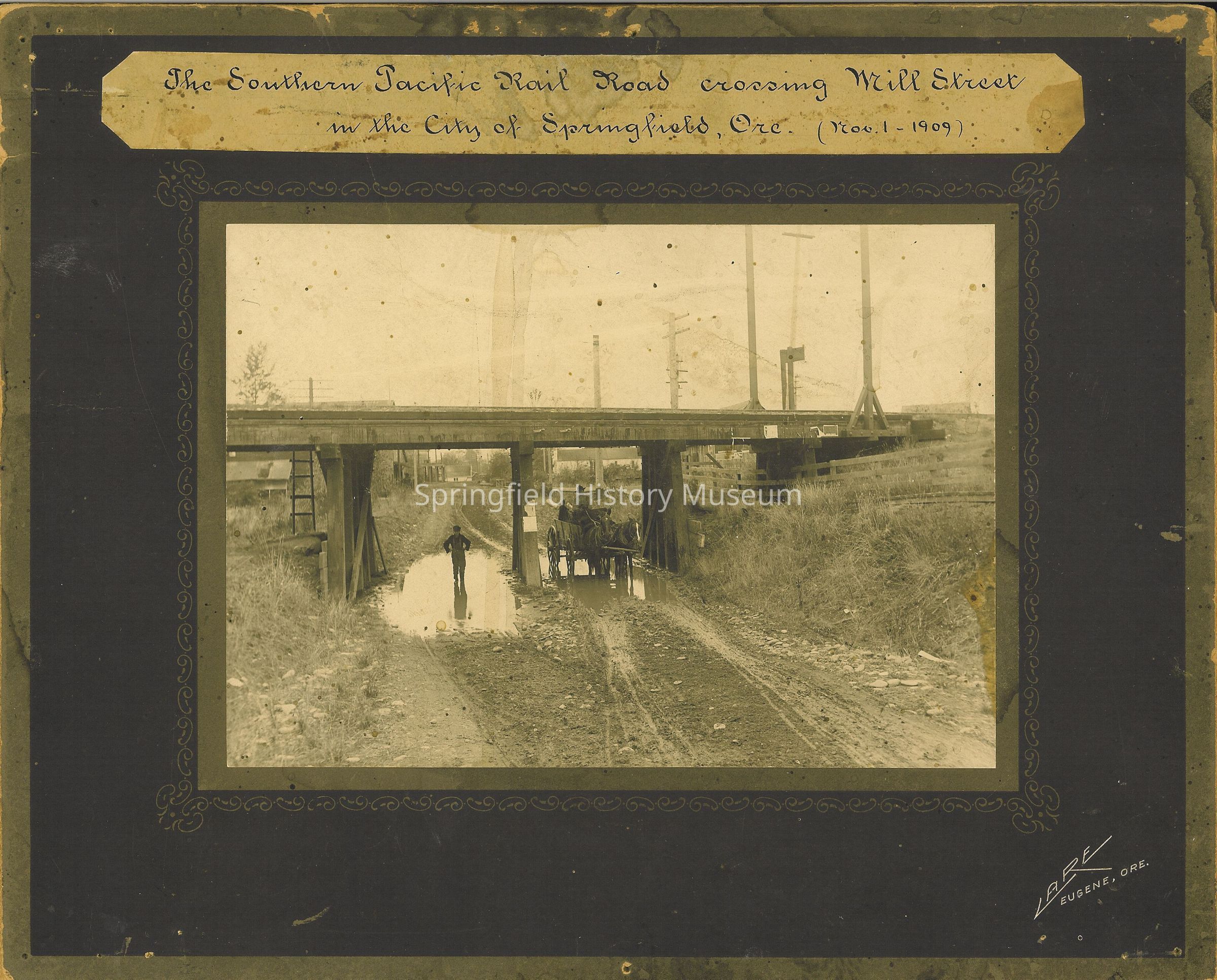 Photograph of Southern Pacific Railroad crossing Mill Street in Springfield. Shows end of bridge with horse and wagon going under bridge on a muddy road. Boy standing in large puddle. Mounted on dark cardboard has design around edges near photo. 2 duplicates. Photographer: Lare, Eugene, Oregon