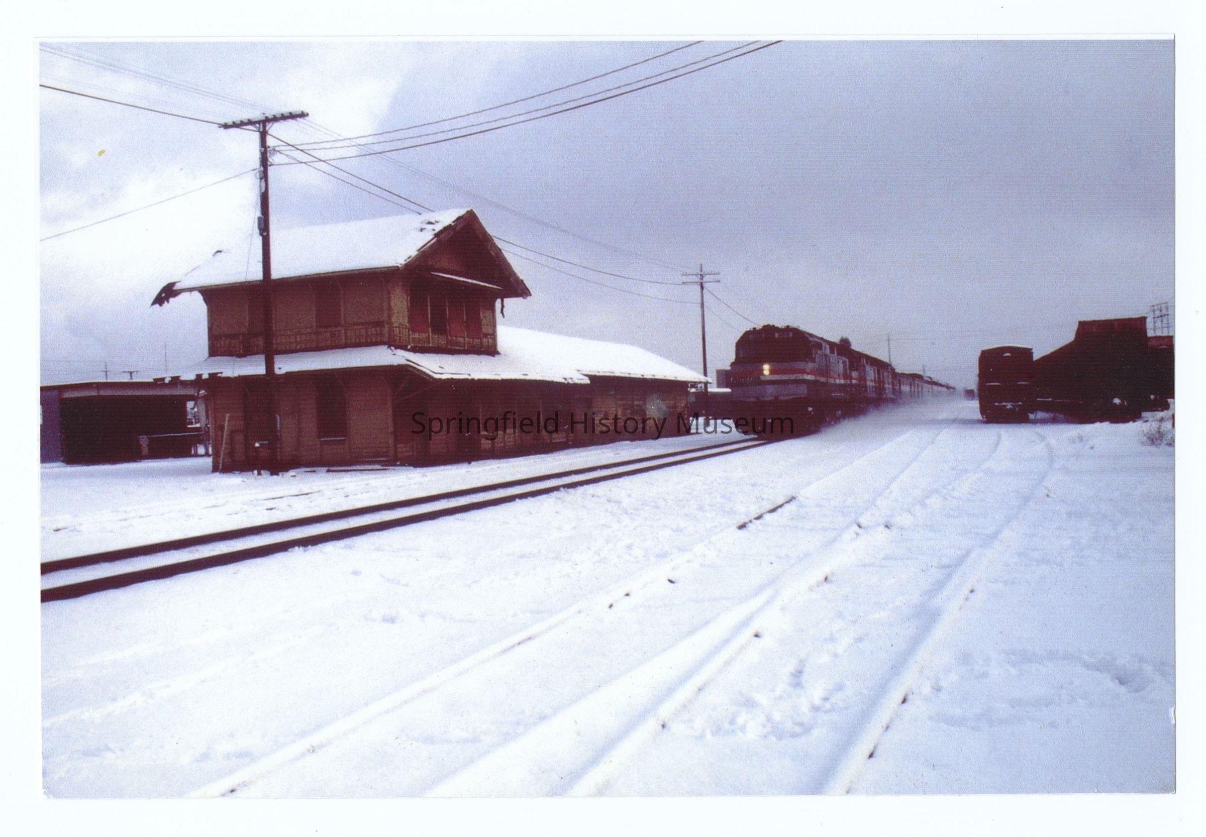 Photograph of the Springfield Train Depot during winter, undated, circa 1980. Snow and incoming train.Photograph Details