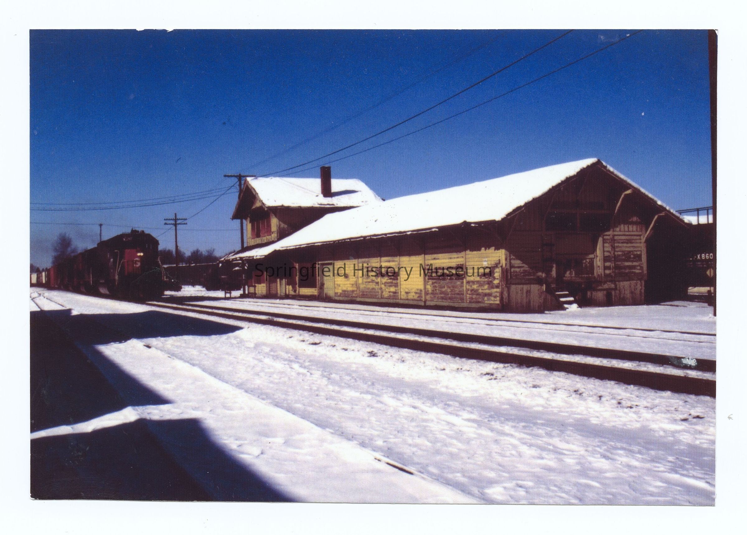 Photograph of the Springfield Train Depot during winter, undated, circa 1980. Snow and incoming train.Photograph Details