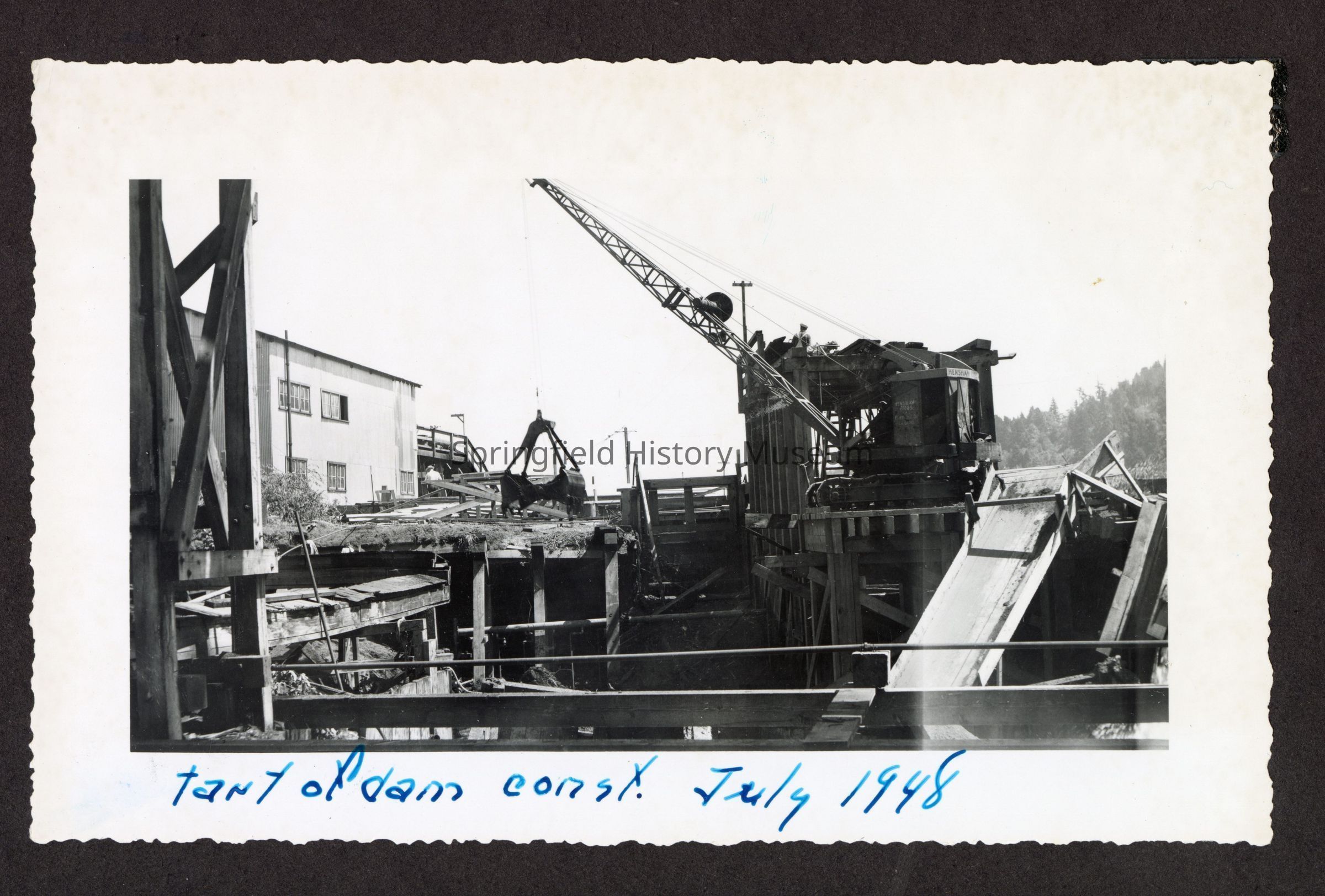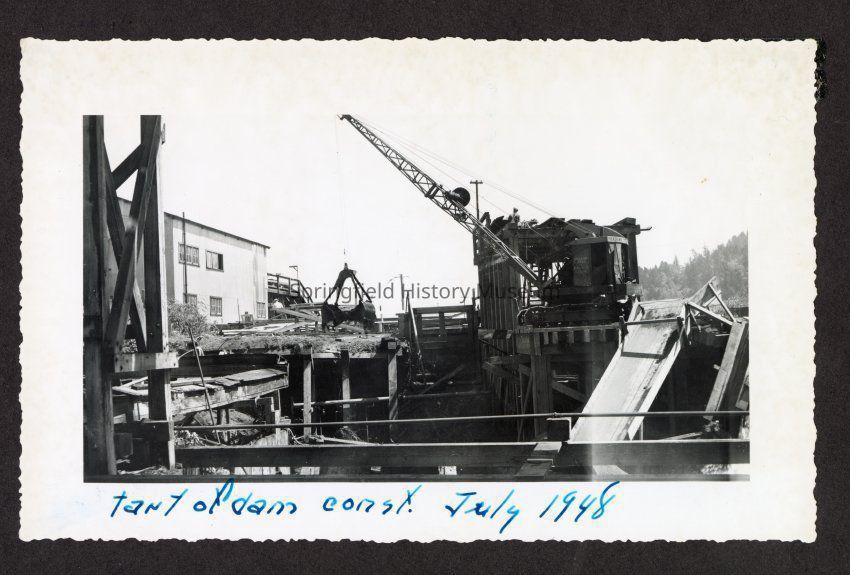 Photograph of the start of dam construction at Booth-Kelly Lumber Mill, on bottom in pen: "[s]tart of dam const. July 1948"