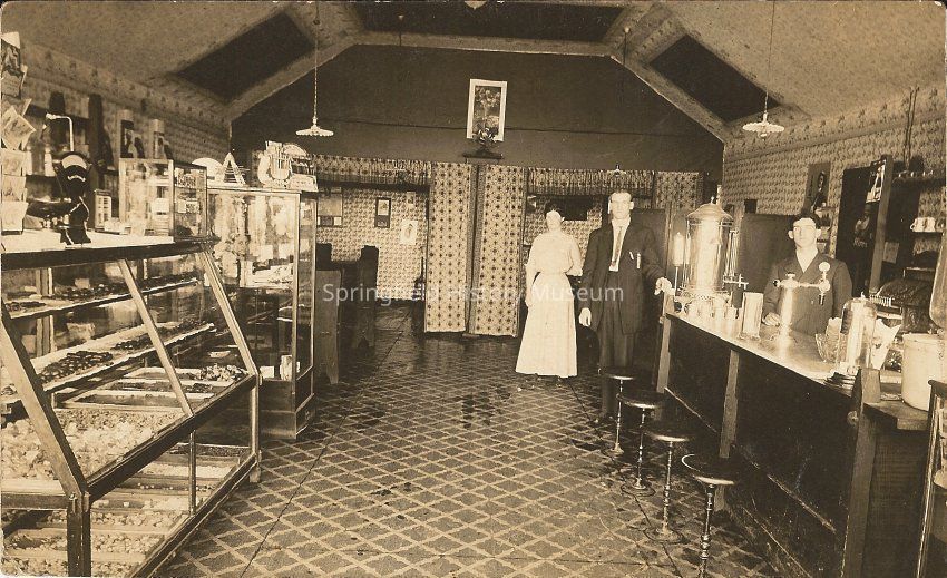 Post card in an envelope. Envelope has "The Sweet Shop on 3rd or 4th and Main. owned by Ola Harkins and Bertha Harkins. given to the Museum by Edna Crocker, 2592 Dumas Dr, Spfld Ore - 97477" Photo shows three people standing in a long dark room with candy display cases down one side and a soda fountain on other side.