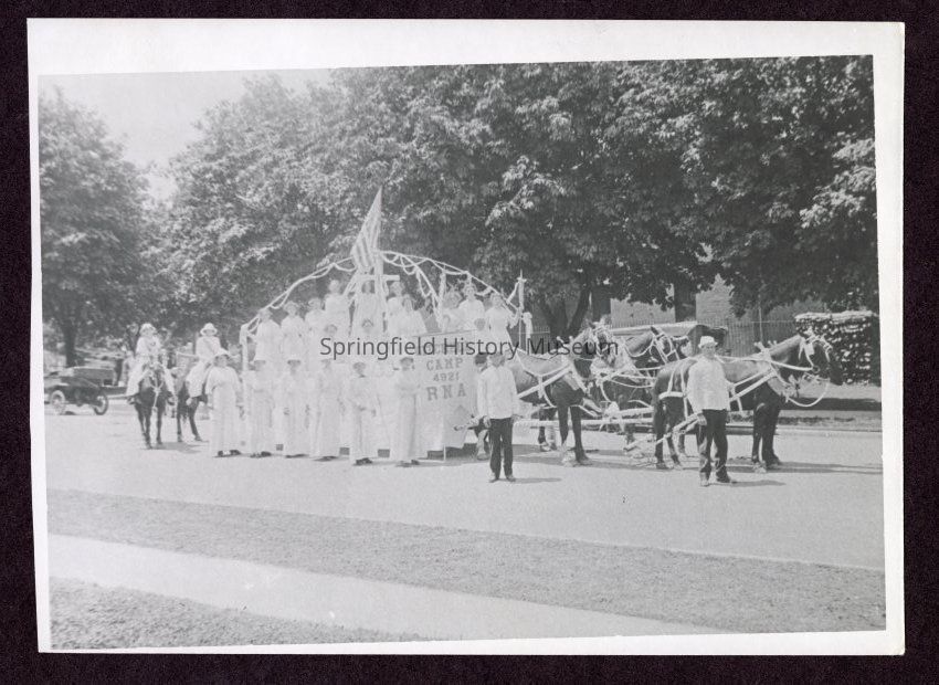 Photograph of pageant float drawn by a team of four horses. Two men and 21 women in matching outfits. The women on the float bear this banner: "Gitchell Camp 4921 RNA." A cross and American flag top the float. Undated