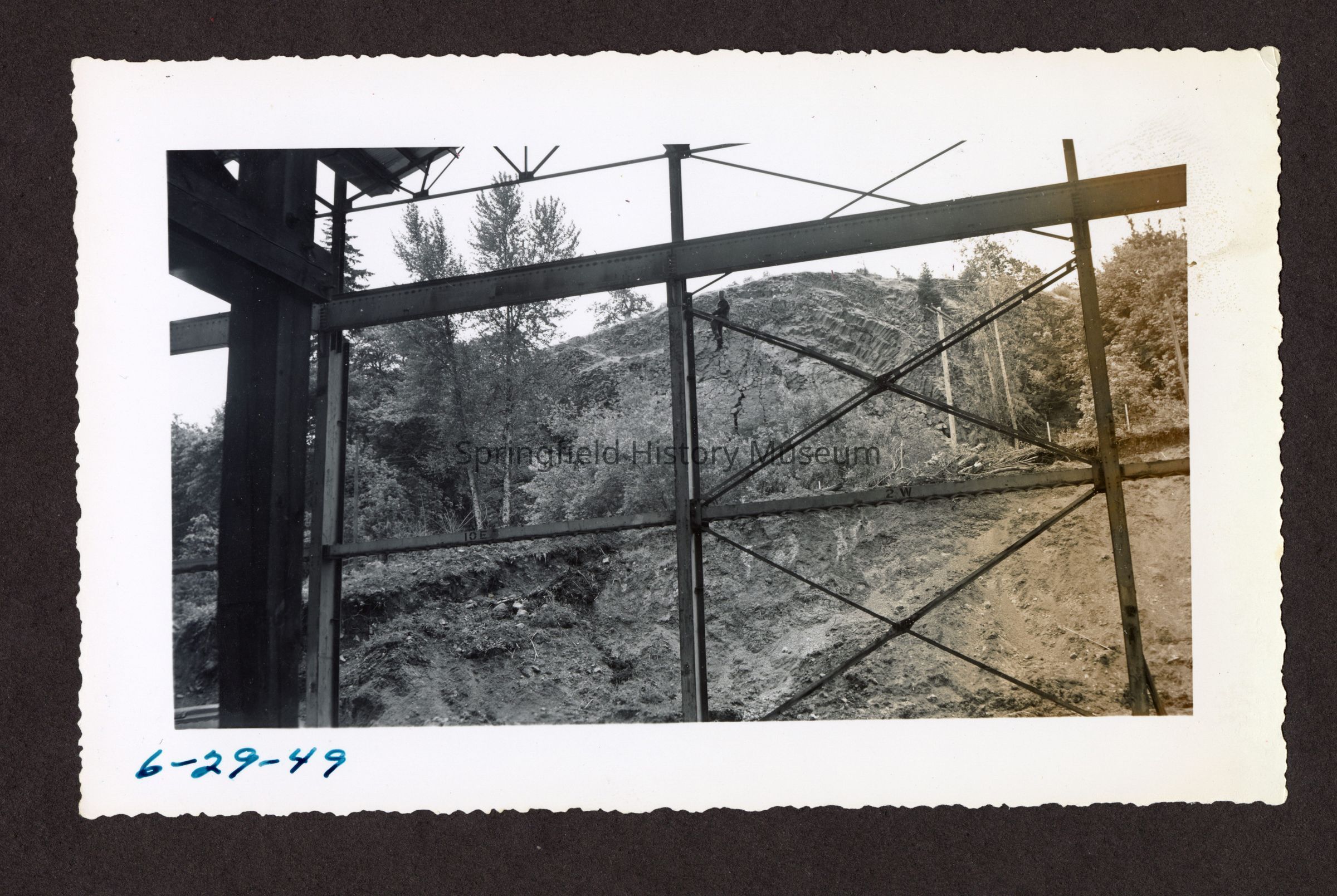 Photograph of the underside of a bridge or a large metal structure with an unknown man on one of the beams Transcribed inscription on front: "6-29-49"