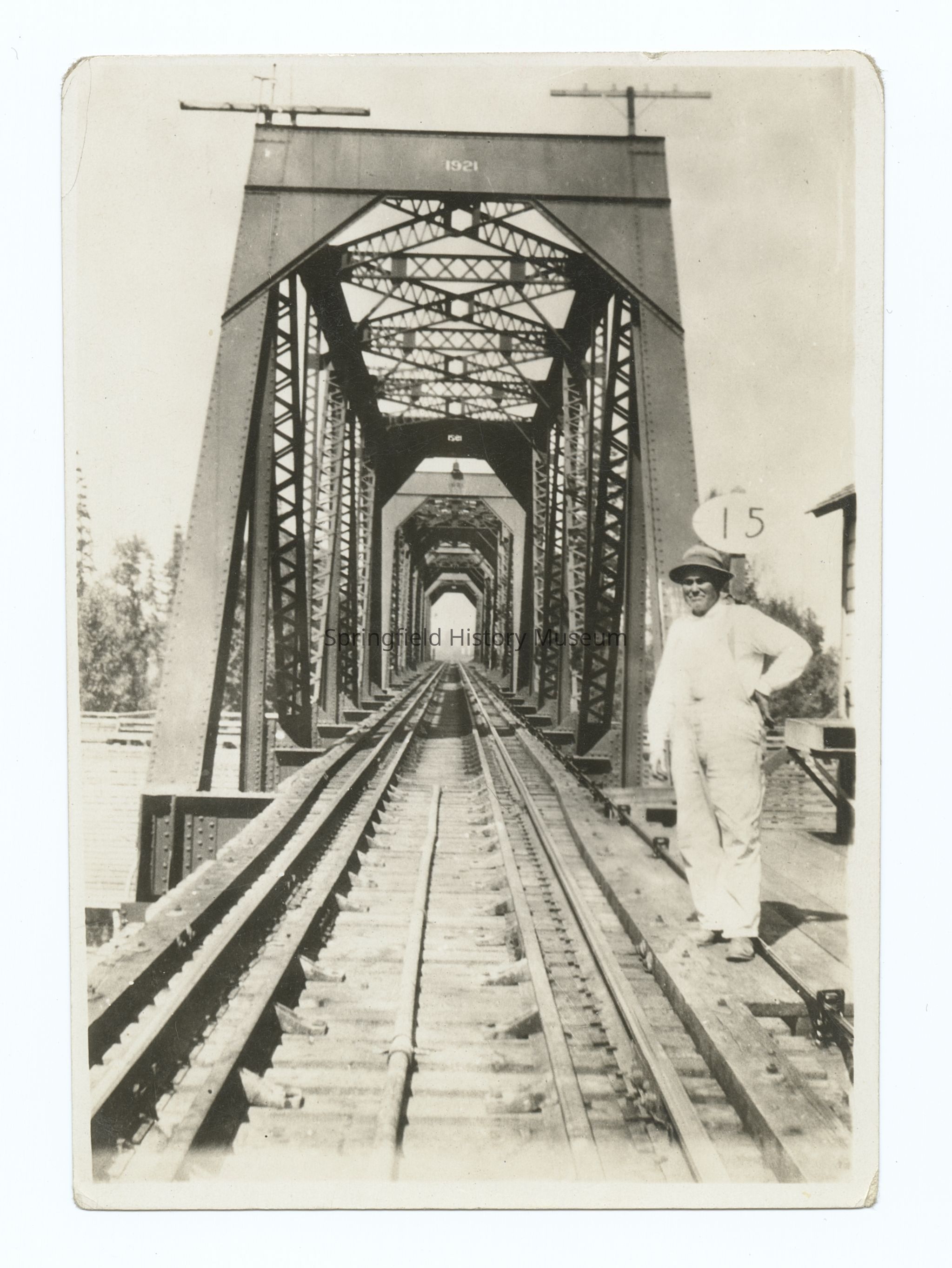 Photograph of Thomas P. Skelly, bridgetender Albany, undated. Shows railroad truss bridge Albany.Photograph Details