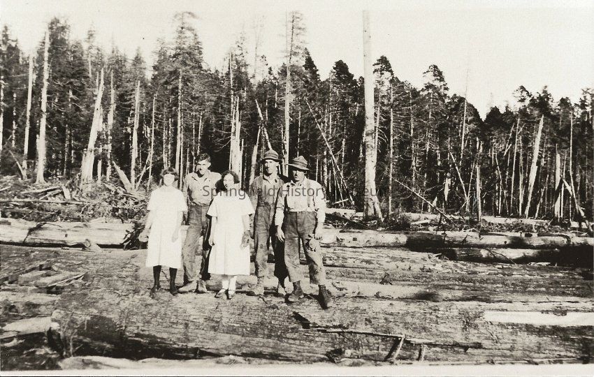 Photograph of three men and two young women standing in a clear cut on a log. Undated and unknown location