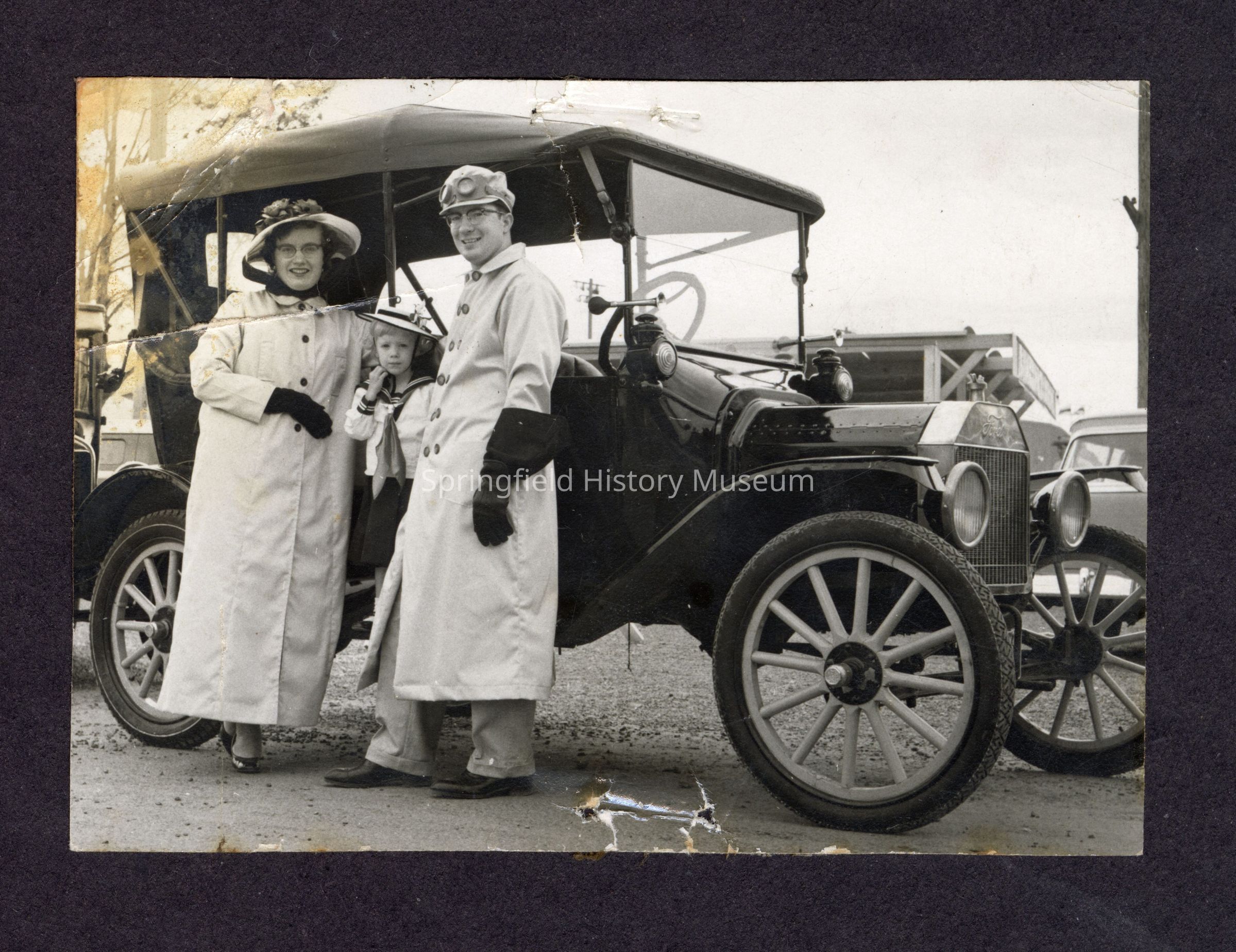 Black and white photograph of three motorists in front of an old Ford automobile. There is a little kid in a sailor suit and hat standing against the car between a woman and man in long duster coats and hats. The man has driving goggles on his head. There are three more automobiles in the background. There are staple tears and staining on the image. Undated.Collection