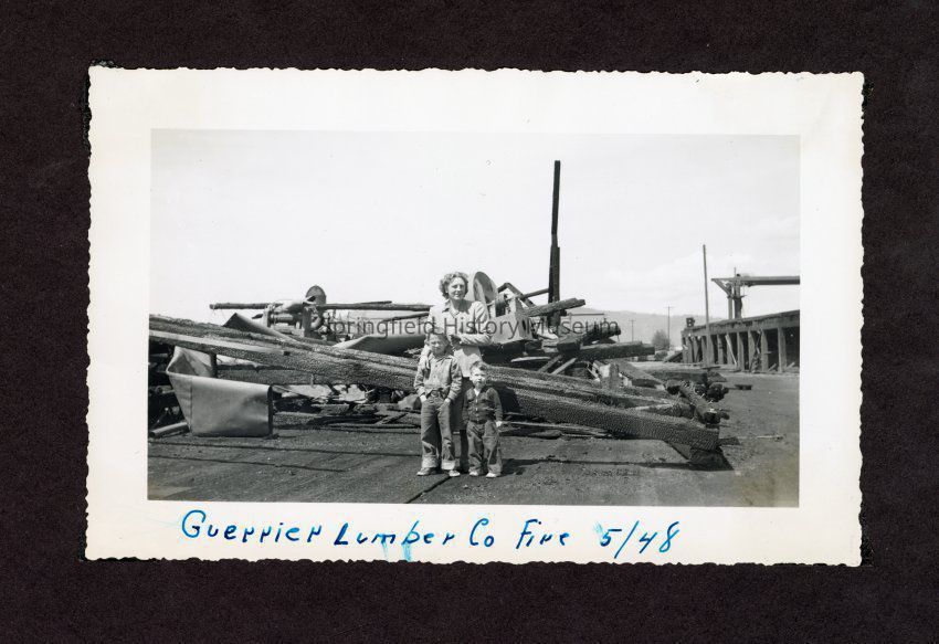 Photograph of a women and two young boys infron of scrap machinery from the Guerrier Fire, on bottom in pen: "Guerrier Lumber Co Fire 5/48