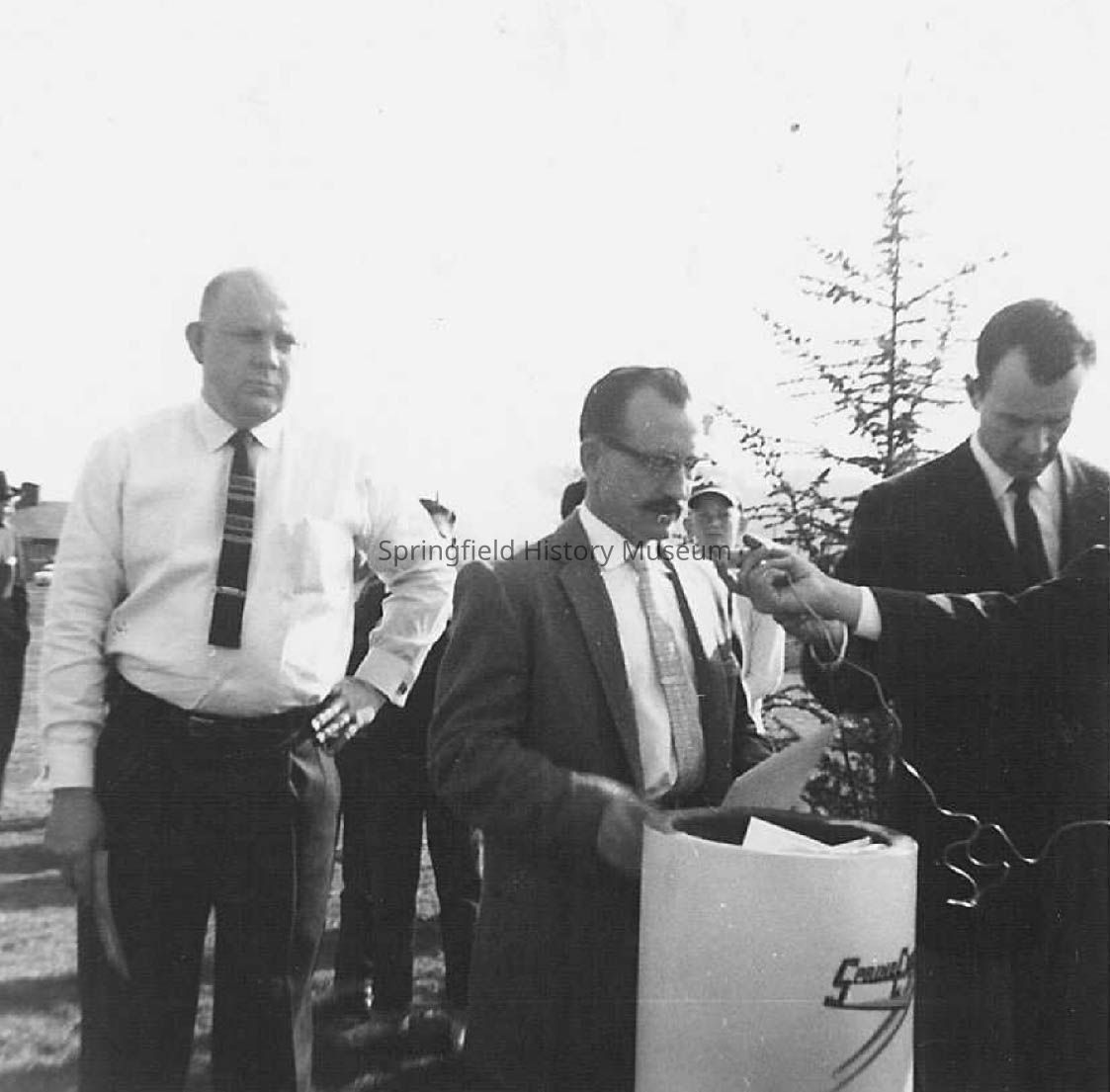 Photograph of three unknown men adding more items to time capsule for Oregon Centennial celebration, 1959. Arm on right side of picture appears to be holding a small microphone.