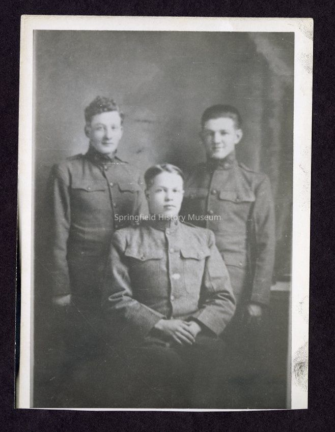 PHOTO of 3 young men in military uniforms. Orval Wegner (back left), Orville Wegner Zingerling (back right), and Lee Fountain (in front). Undated, unknown location