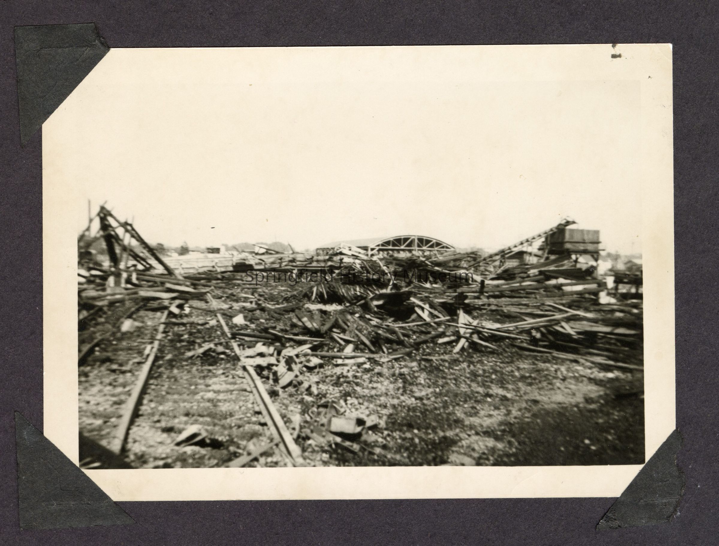 Photograph of tracks and lumber at Clear Fir mill after fire, photo taken by John and Jim Miller,