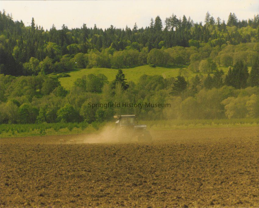A tractor plowing hops field at Seavey farms, 1996