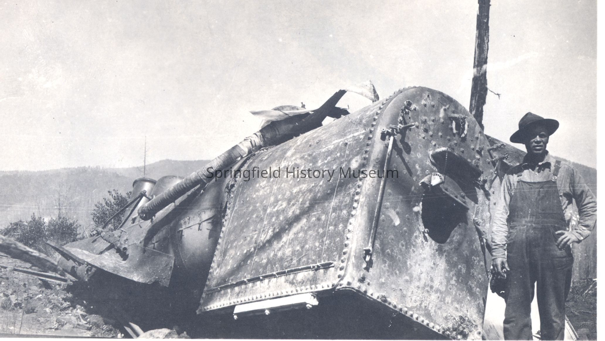 Photograph of Dave Bishop standing next to the wrecked boiler and firebox of the Booth-Kelly 4-Spot Heisler. There was a catastrophic boiler explosion of on April 23, 1920, which occurred while navigating the Camp 9 switchbacks on the way to the camp, three men died, two survived