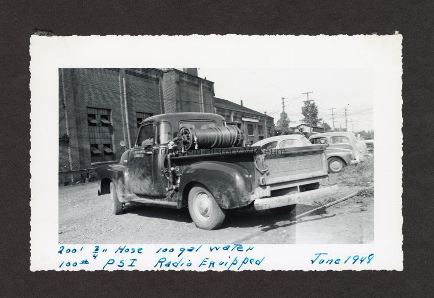 Photograph of truck with hose, on bottom in pen: "200' 3/4" hose 100qal water 100# PSI Radio equipped, June 1948