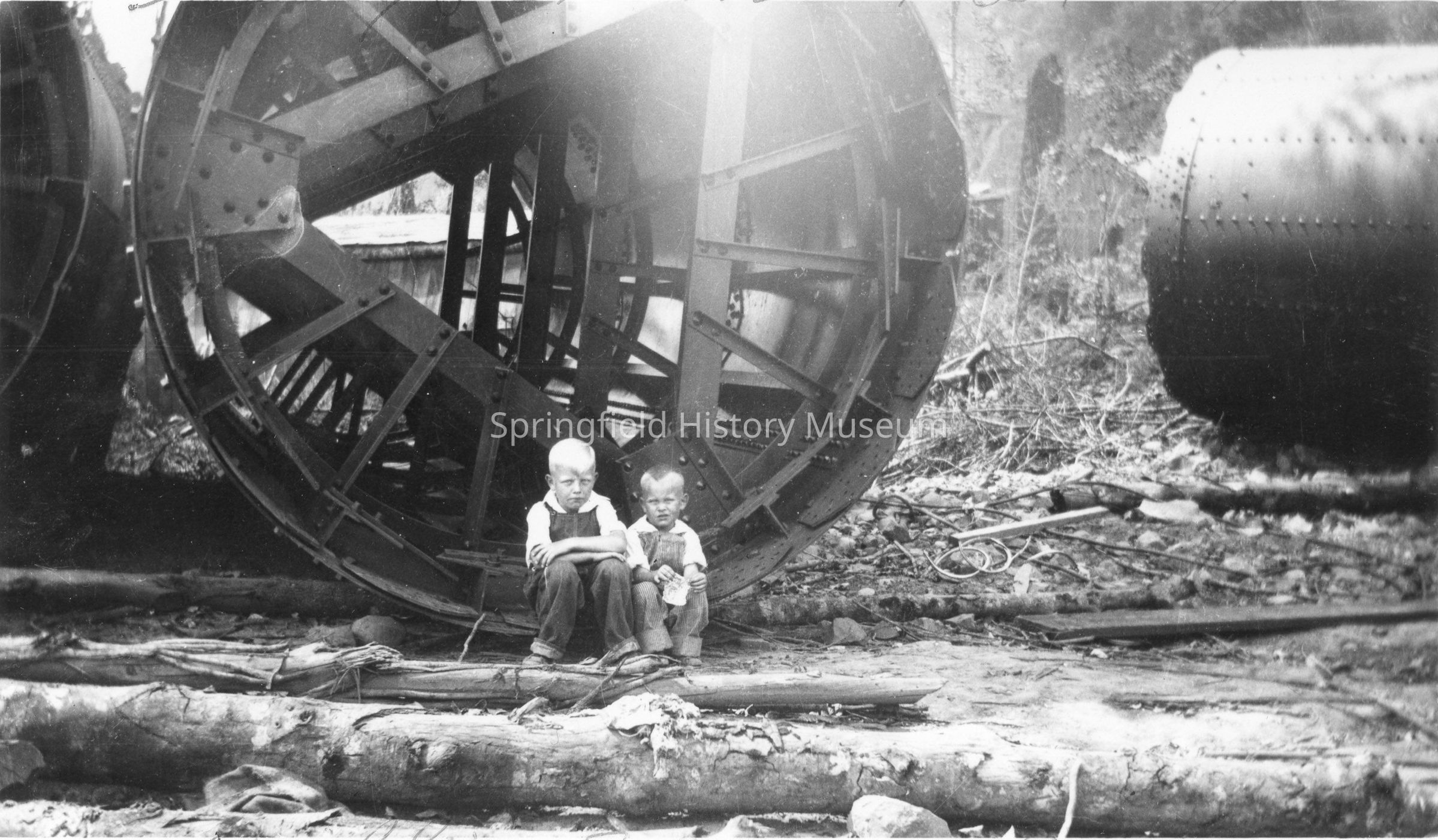 Two small boys seated on the rim of a large wheel. Marked on front in ink: Sidney Peterson, Walt Laxton Jr, Building of Leaburg Dam.Photograph Details