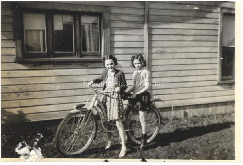 Photograph of Jeanne Daniels as a young girl on her bicycle. Jeanne is at the front of the bicycle, and an unidentified girl sits behind her. Photo taken in front of house. Photo appears to be later copy of original image. Measures 4"x6".Relationships