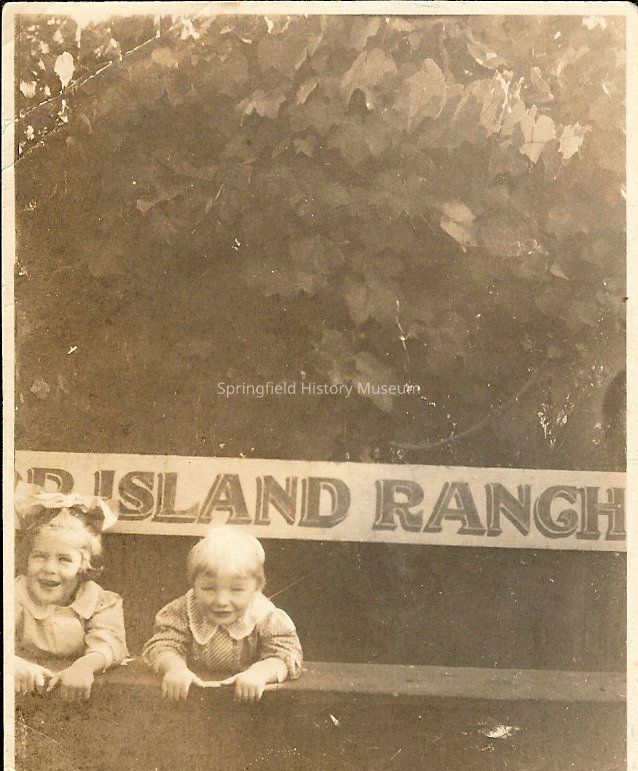 Photograph of two girls named Hazel and Holly in front of Hop Island Ranch sign, undated