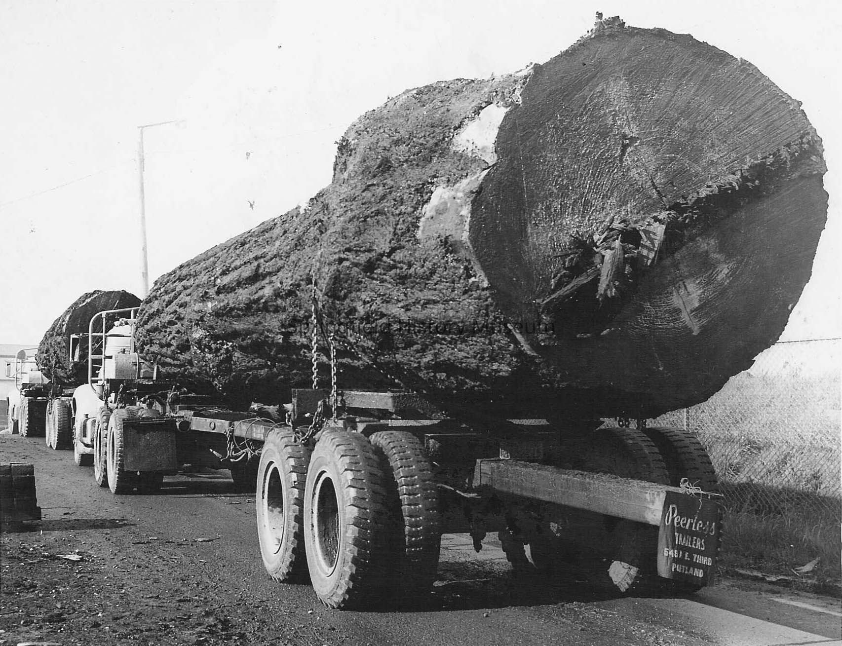 Photograph of two loaded logging trucks, end to end, each carrying one huge log. UndatedCollection